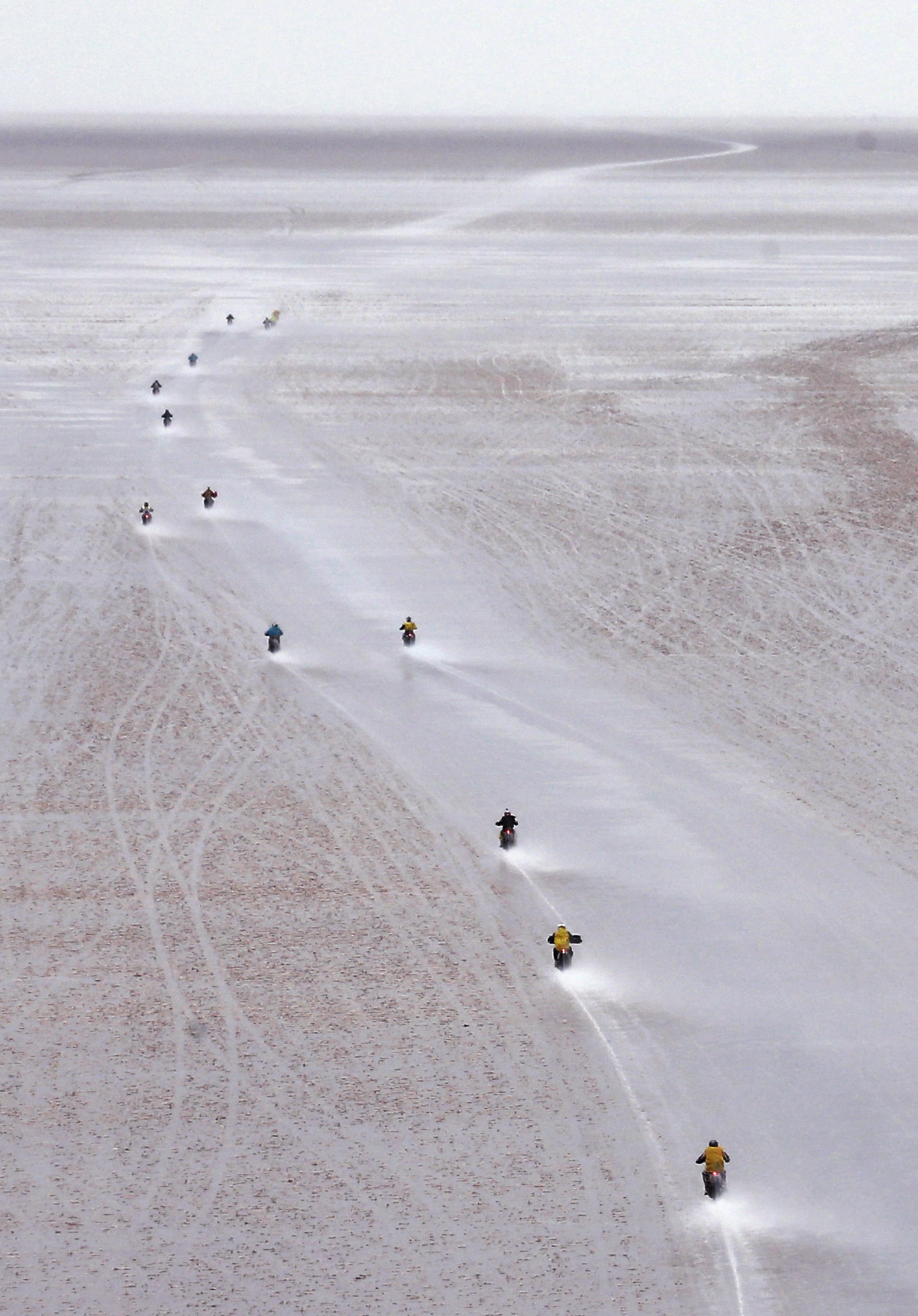 Dakar competitors riders begin the 8th stage of the Dakar Rally 2015 on the Salar de Uyuni salt flat, from Uyuni to Iquique, January 12, 2015. REUTERS/Jean-Paul Pelissier (CHILE - Tags: SPORT MOTORSPORT TPX IMAGES OF THE DAY) *** Local Caption *** Pebalap memulai etape ke-8 Rally Dakar 2015 dari Uyuni ke Iquique di dataran garam Salar de Uyuni, Chili, Senin (12/1). ANTARA FOTO/REUTERS/Jean-Paul Pelissier/ox/15.