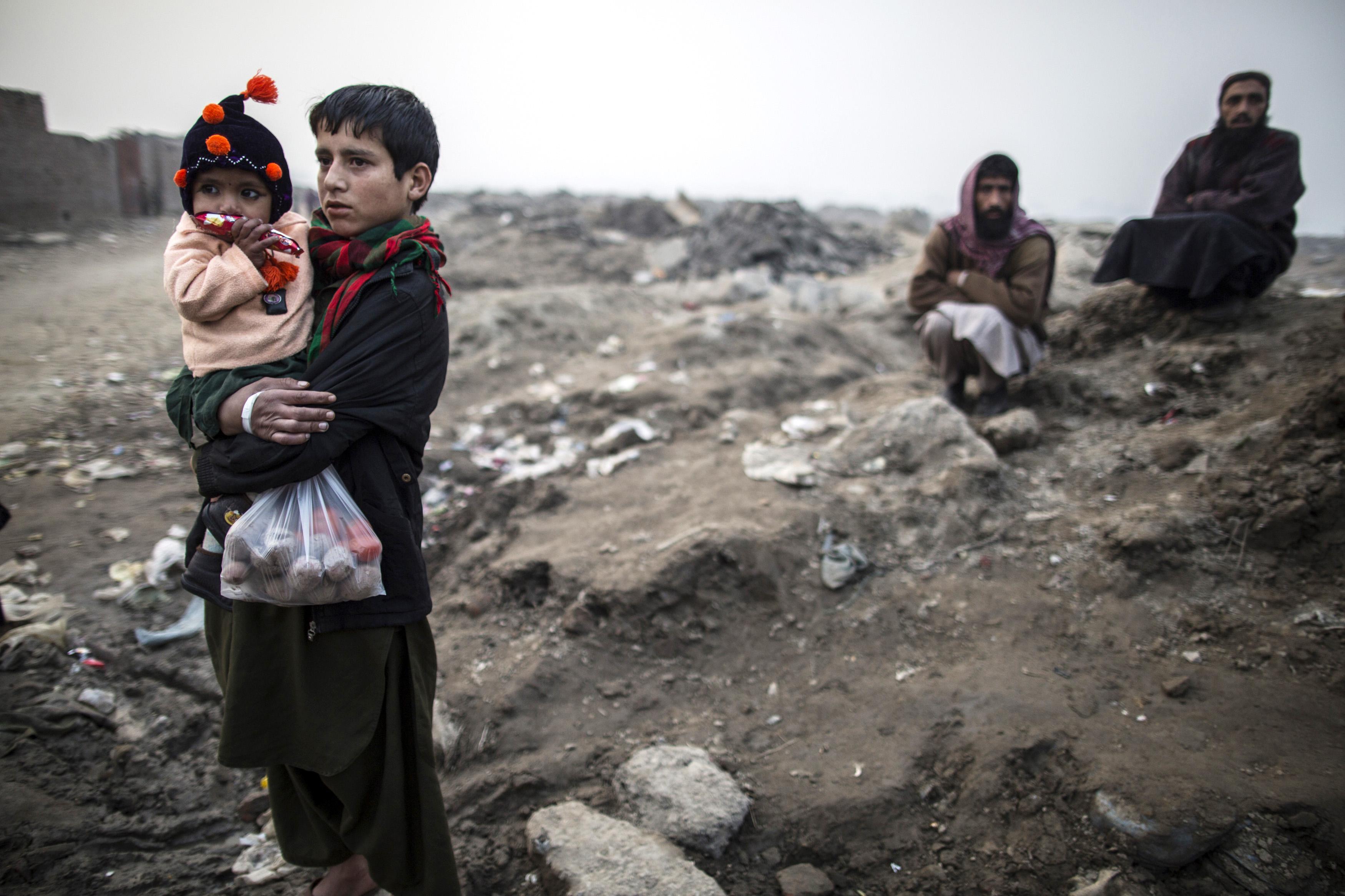 A teenage boy carries his sibling in a slum on the outskirts of Lahore January 12, 2015. REUTERS/Zohra Bensemra (PAKISTAN - Tags: SOCIETY TPX IMAGES OF THE DAY) *** Local Caption *** Seorang pemuda menggendong adiknya di sebuah pemukiman kumuh di pinggiran kota Lahore, Pakistan, Senin (12/1). ANTARA FOTO/REUTERS/Zohra Bensemra/ox/15/