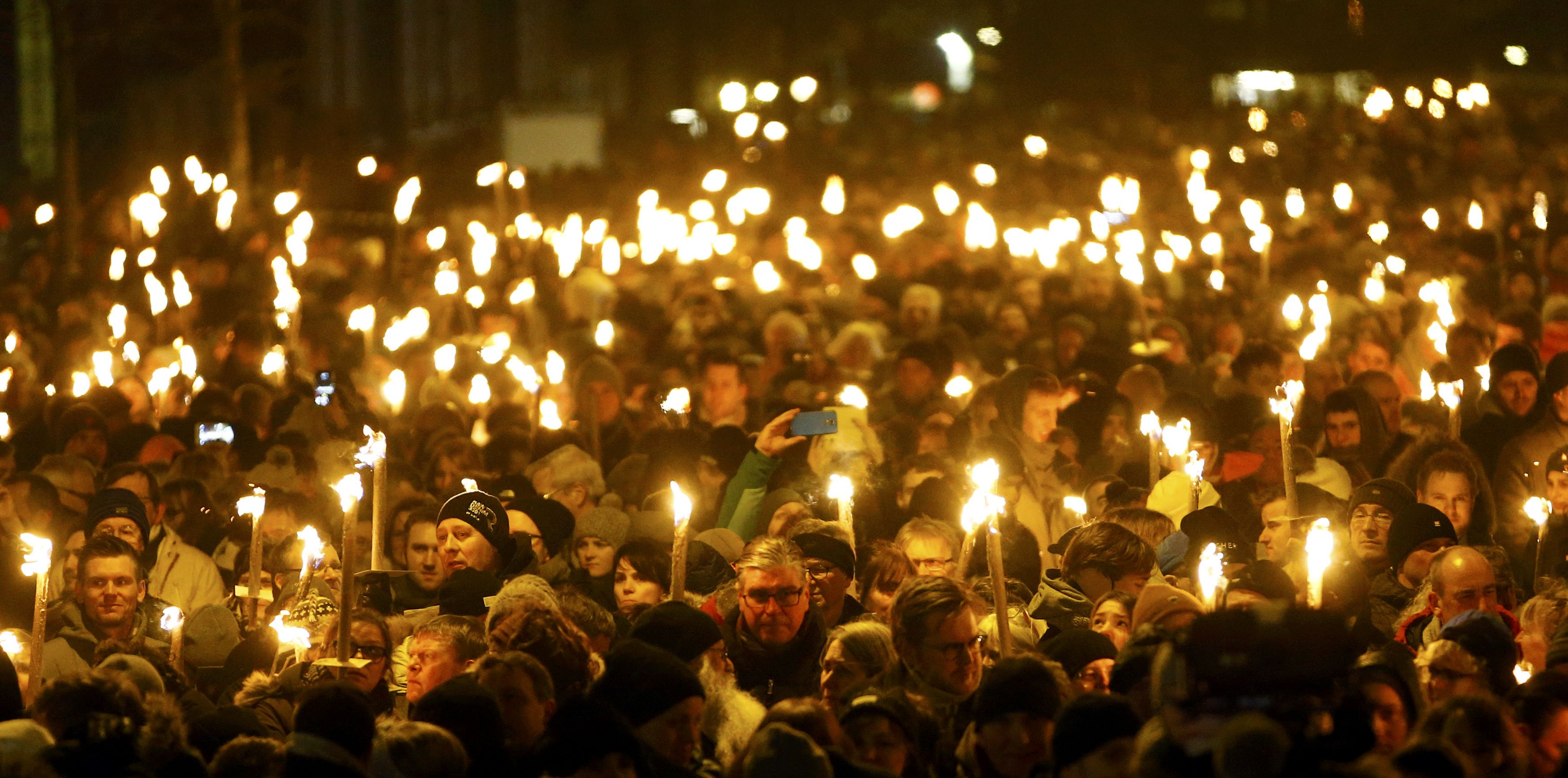 People hold candles as they attend a memorial service held for those killed on Saturday by a 22-year-old gunman, in Copenhagen February 16, 2015. Danish police said on Monday they had charged two people with aiding the man suspected of shooting dead two people in attacks on a synagogue and an event promoting free speech in Copenhagen at the weekend. The shootings, which Danish Prime Minister Helle Thorning-Schmidt called acts of terrorism, sent shockwaves through Denmark and have been compared to the January attacks in Paris by Islamist militants that killed 17. REUTERS/Leonhard Foeger (DENMARK - Tags: CRIME LAW POLITICS RELIGION CIVIL UNREST TPX IMAGES OF THE DAY) *** Local Caption *** Warga membawa lilin saat mereka mengikuti malam renungan di Copenhagen, Denmark, Senin (16/2), untuk para korban yang tewas dalam serangan di sinagoga oleh pemuda berusia 22 tahun. Polisi Denmark mengatakan mereka mendakwa dua orang yang membantu tersangka penyerangan sinagoga yang menembak mati dua orang dan sebuah acara yang memromosikan kebebasan berpendapat di Copenhagen akhir pekan lalu. Insiden penembakan yang disebut oleh Perdana Menteri Helle Thorning-Schmidt sebagai aksi terorisme itu menggemparkan negara Denmark dan dibanding-bandingkan dengan serangan militan Islamis di Paris Januari lalu, yang menewaskan 17 orang. ANTARA FOTO/REUTERS/Leonhard Foeger/ox/15.
