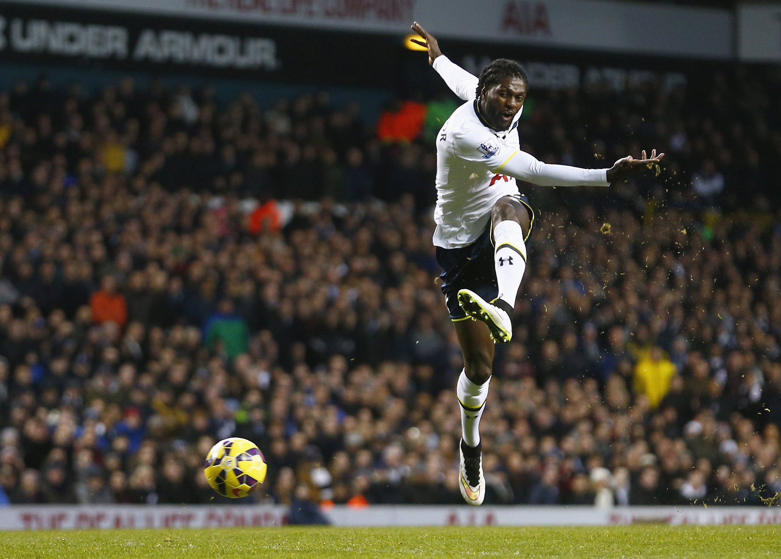 Emmanuel Adebayor of Tottenham Hotspur has a shot at goal against Sunderland during their English Premier League soccer match at White Hart Lane, London, January 17, 2015. REUTERS/Andrew Winning (BRITAIN - Tags: SPORT SOCCER TPX IMAGES OF THE DAY) FOR EDITORIAL USE ONLY. NOT FOR SALE FOR MARKETING OR ADVERTISING CAMPAIGNS. NO USE WITH UNAUTHORIZED AUDIO, VIDEO, DATA, FIXTURE LISTS, CLUB/LEAGUE LOGOS OR "LIVE" SERVICES. ONLINE IN-MATCH USE LIMITED TO 45 IMAGES, NO VIDEO EMULATION. NO USE IN BETTING, GAMES OR SINGLE CLUB/LEAGUE/PLAYER PUBLICATIONS *** Local Caption *** Pemain Tottenham Hotspur Emmanuel Adebayor berusaha mencetak gol ke gawang Sunderland dalam pertandingan sepak bola Liga Premier Inggris di White Hart Lane, London, Sabtu (17/1). Tottenham menang 2-1 atas Sunderaand. ANTARA FOTO/REUTERS/Andrew Winning/ox/15.