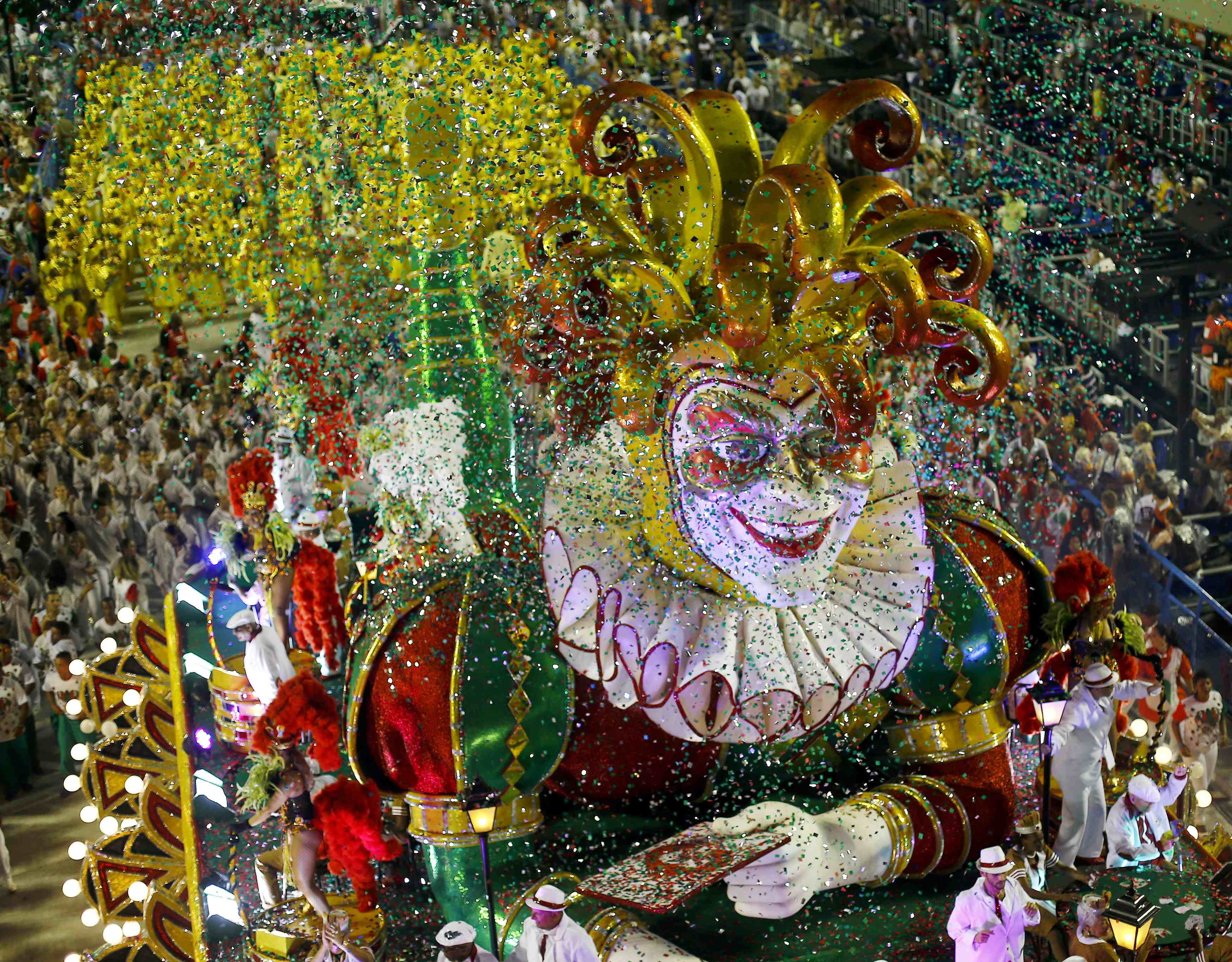 Revellers from the Grande Rio samba school participate in the annual carnival parade in Rio de Janeiro's Sambadrome, February 16, 2015. REUTERS/Ricardo Moraes (BRAZIL - Tags: ENTERTAINMENT SOCIETY TPX IMAGES OF THE DAY) *** Local Caption *** Peserta dari Sekolah Samba Grande Rio beraksi di parade karnaval tahunan di Sambadrome, Rio de Janeiro, Brazil, Senin (16/1). ANTARA FOTO/REUTERS/Ricardo Moraes/ox/15.