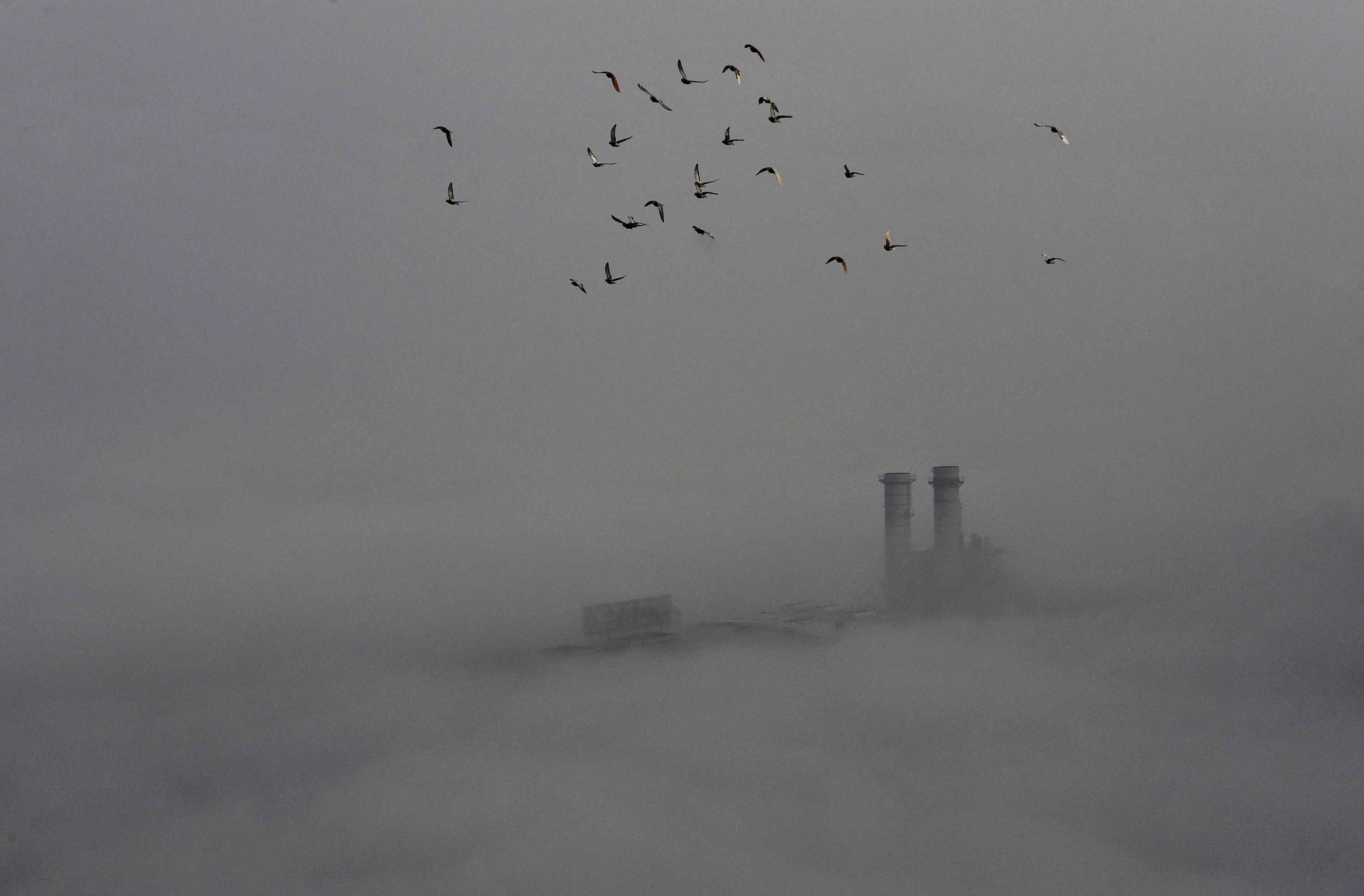 Birds fly across the sky on a polluted day in Wuhan, Hubei province, February 16, 2015. REUTERS/Stringer (CHINA - Tags: ENVIRONMENT ANIMALS TPX IMAGES OF THE DAY) CHINA OUT. NO COMMERCIAL OR EDITORIAL SALES IN CHINA *** Local Caption *** Sekelompok burung terbang di atas kota Wuhan, Hubei, Tiongkok, yang diselimuti polusi, Senin (16/1). ANTARA FOTO/REUTERS/Stringer/ox/15.