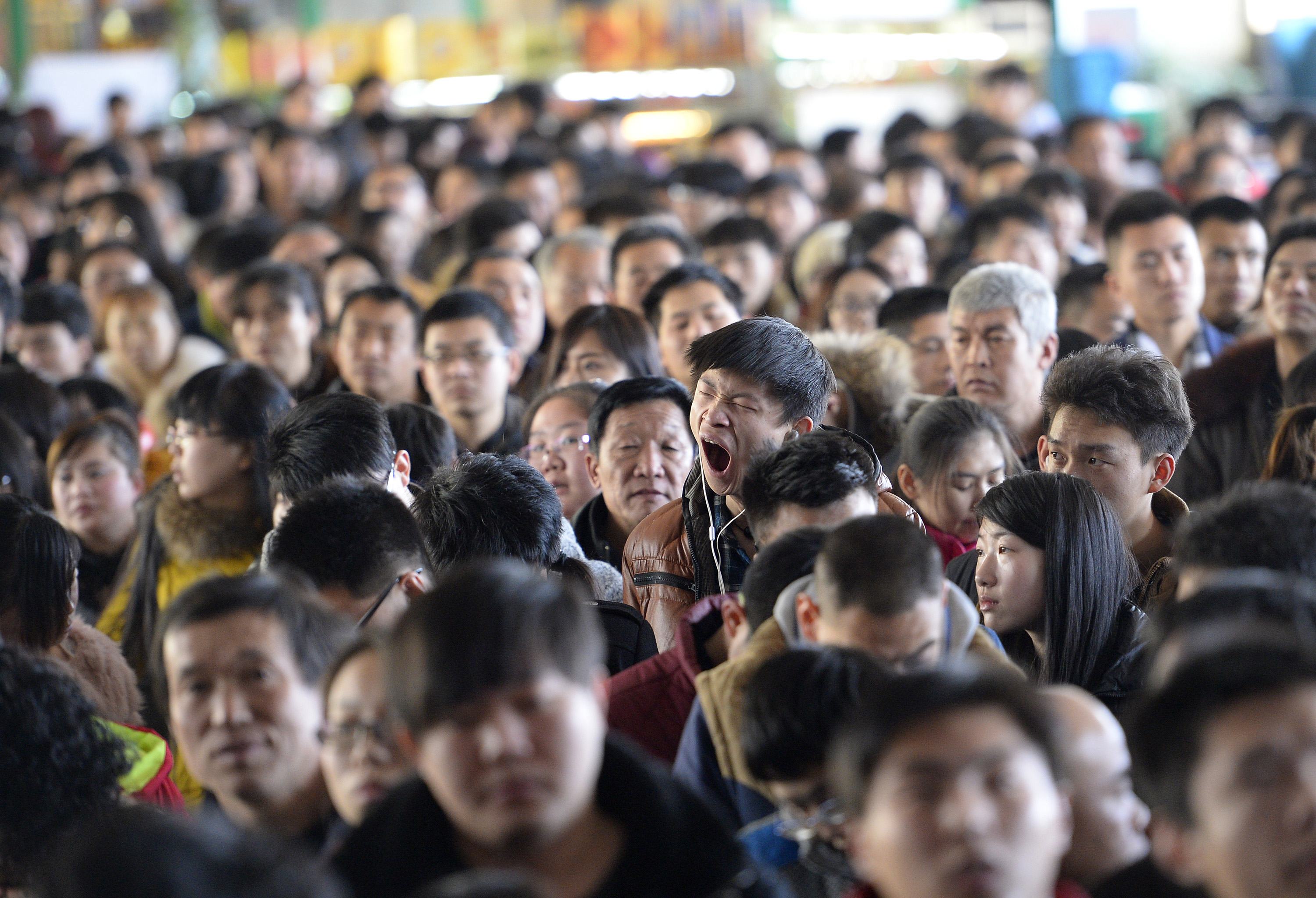 A man yawns at a railway station in Taiyuan, Shanxi province, February 16, 2015. The Chinese Ministry of Transport said a total of 2.807 billion trips are expected to be made during the 40-day Spring Festival travel rush, which started on February 4 and will last until March 16, Xinhua News Agency reported. REUTERS/Jon Woo (CHINA - Tags: TRANSPORT SOCIETY TPX IMAGES OF THE DAY) CHINA OUT. NO COMMERCIAL OR EDITORIAL SALES IN CHINA *** Local Caption *** Seorang pria menguap di sebuah stasiun kereta api di Taiyuan, provinsi Shanxi, Tiongkok, Senin (16/1). Kementerian Transportasi Tiongkok memperkirakan akan ada 2,807 miliar perjalanan dalam mudik Festival Musim Semi yang akan berlangsung selama 40 hari dari 4 Februari hingga 16 Maret 2015. ANTARA FOTO/REUTERS/Jon Woo/ox/15.
