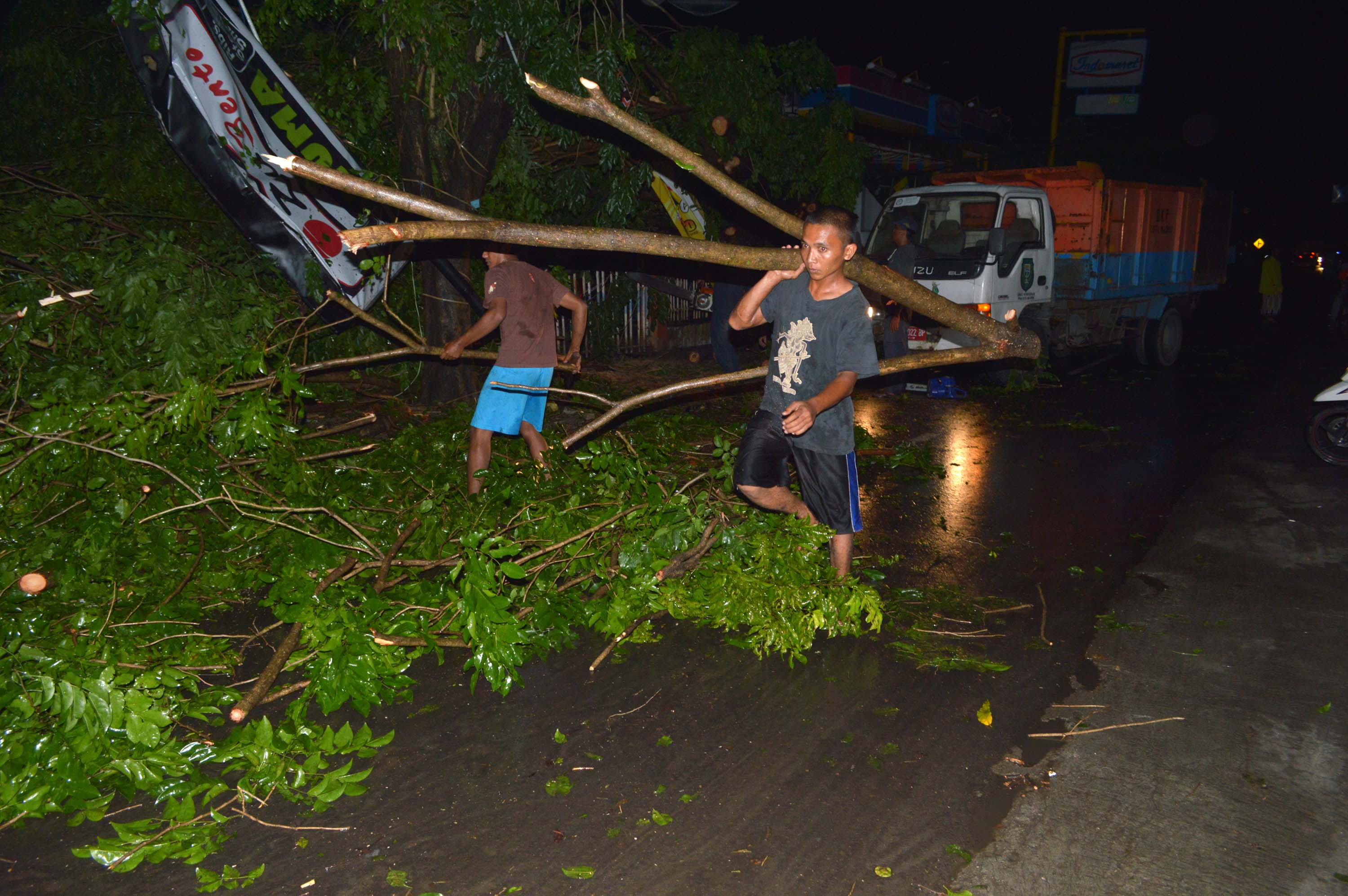 (Berita Daerah – Madiun) Warga memotong batang pohon yang tumbang dan menutup jalan di Kota Madiun, Jatim, Selasa (17/2) malam. Hujan deras disertai angin kencang menumbangkan sejumlah pohon, tiang Lampu Penerangan Jalan Umum (LPJU), tower radio serta listrik di seluruh wilayah kota padam.