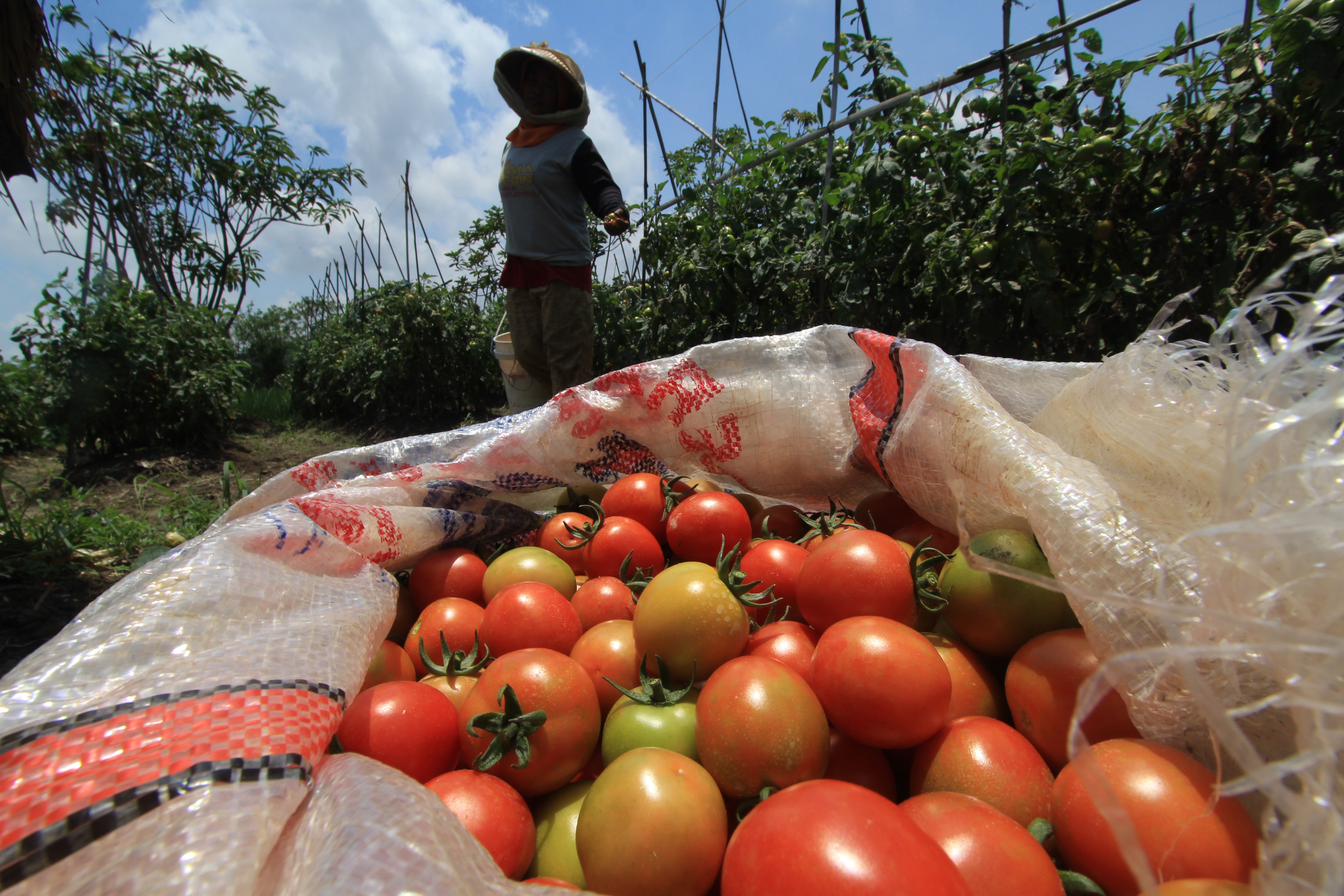 (Berita daerah – Indramayu) Seorang petani memanen buah tomat di desa Dermayu, Sindang, Indramayu, Jawa Barat, Senin (23/2). Akibat panen tomat yang bersamaan di daerah lain membuat harga tomat ditingkat petani turun drastik dari harga RP. 6.000 per kilogram menjadi Rp. 2.000 per kilogram.
