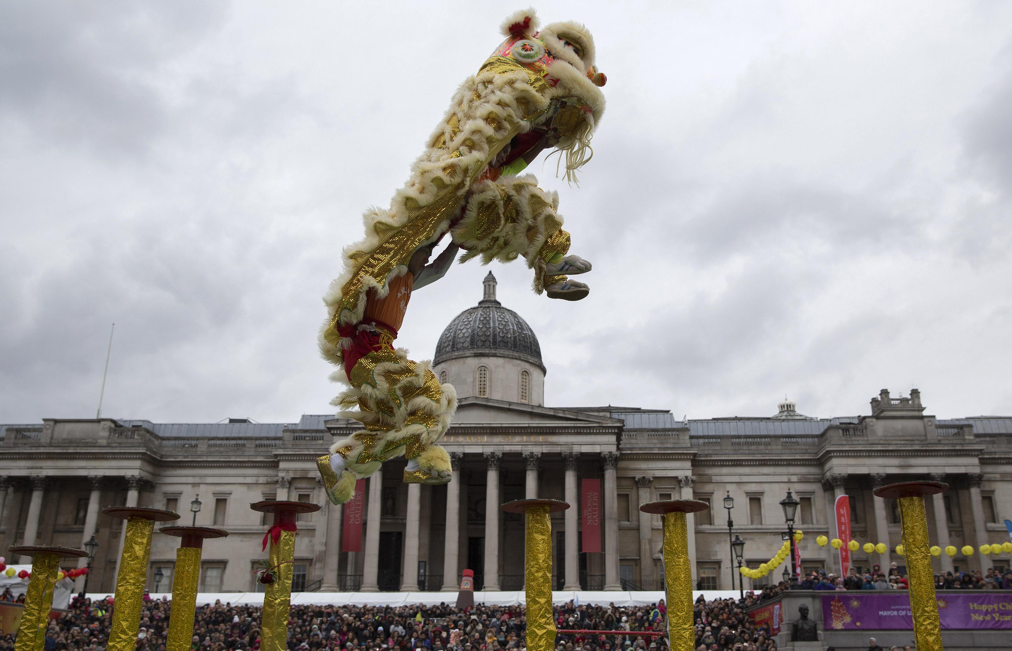 Performers dressed in traditional costume perform the 'flying lion dance' to celebrate the Chinese New Year at Trafalgar Square in London, February 22, 2015. REUTERS/Neil Hall (BRITAIN - Tags: ANNIVERSARY SOCIETY TPX IMAGES OF THE DAY) *** Local Caption *** Penari dengan kostum tradisional beraksi membawakan tarian singa terbang saat perayaan Tahun Baru Imlek di Lapangan Trafalgar, London, Inggris, Minggu (22/2). ANTARA FOTO/REUTERS/Neil Hall/ox/15.