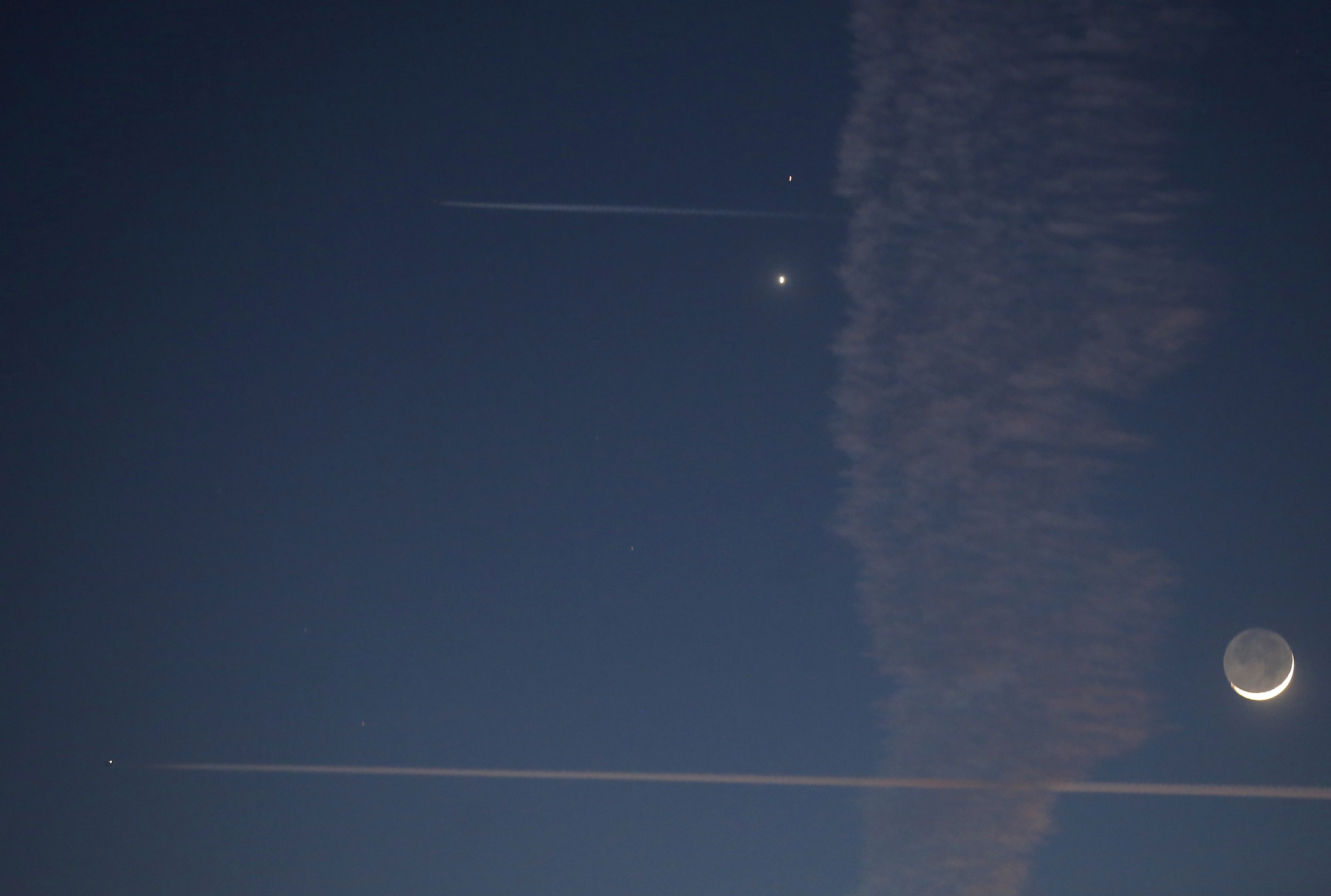 Aircraft fly past with the crescent moon and planets Venus and Mars visible in the sky in central Bosnia February 20, 2015. People in Bosnia witnessed late Friday evening an astronomical event whereby Venus and Mars were accompanied by a crescent moon just after sunset. REUTERS/Dado Ruvic (BOSNIA AND HERZEGOVINA - Tags: SOCIETY TPX IMAGES OF THE DAY ENVIRONMENT) *** Local Caption *** Pesawat melintasi bulan sabit dan planet Venus juga Mars yang dapat dilihat di langit di pusat kota Bosnia, Jumat (20/2). Warga Bosnia berkesempatan menyaksikan kejadian astronomi semalam ketika Venus dan Mars berdekatan dengan bulan sabit sesaat setelah matahari tenggelam. ANTARA FOTO/REUTERS/Dado Ruvic/djo/15