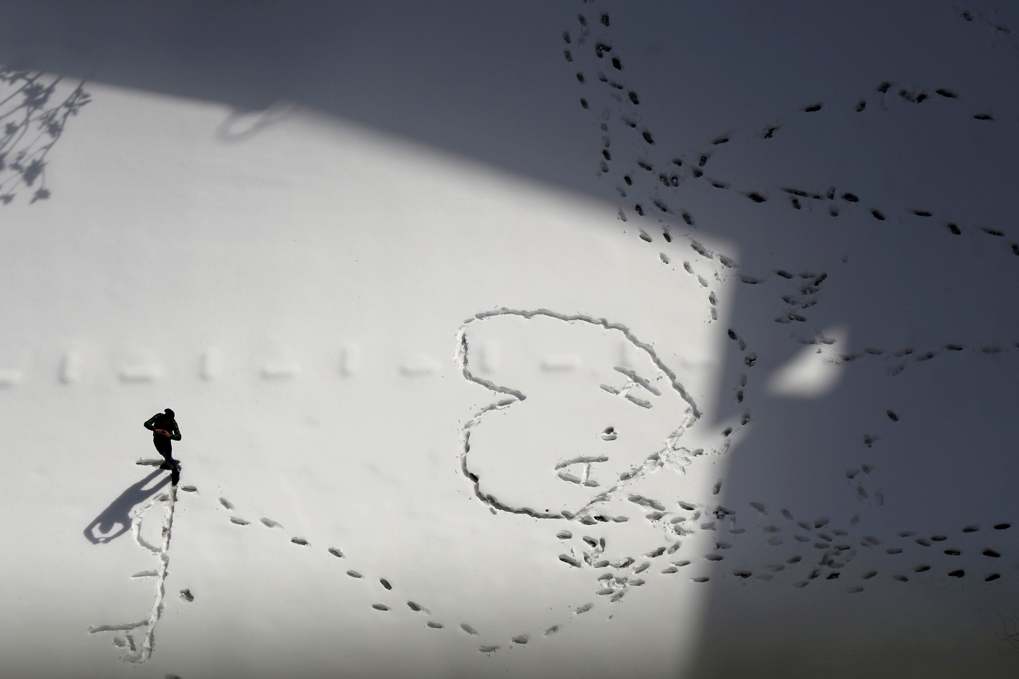 A man makes patterns in the snow during a heavy snowstorm in Amman February 20, 2015. The Jordan Meteorological Department forecasts thunderstorms and rain on Friday with snowfall in areas 600 metres above sea level and higher. REUTERS/Muhammad Hamed (JORDAN - Tags: ENVIRONMENT SOCIETY TPX IMAGES OF THE DAY) *** Local Caption *** Seorang pria membentuk pola diatas salju saat badai salju lebat di Amman, Jumat (20/2). Departemen Meteorologi Yordania meramalkan datangnya badai dan hujan pada hari Jumat diikuti hujan salji di daerah 600 dpl dan lebih tinggi lagi. ANTARA FOTO/REUTERS/Muhammad Hamed/djo/15