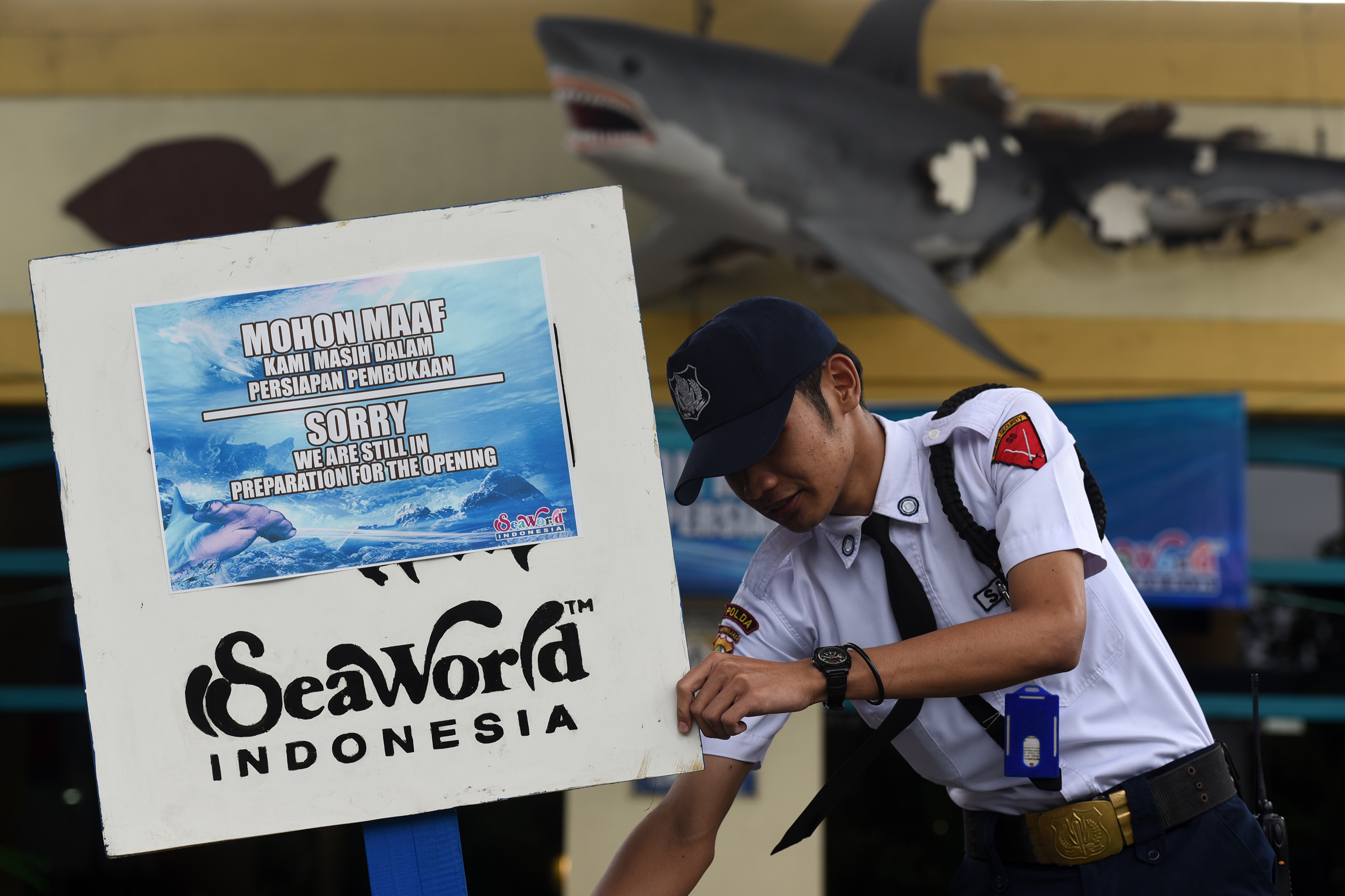 (Berita Daerah – Jakarta) Petugas meletakan papan pemberitahuan di kawasan wahana Sea World, Ancol, Jakarta Utara, Senin (23/2). Manajemen PT Sea World Indonesia akhirnya menyerahkan seluruh aset kepada PT Pembangunan Jaya Ancol dan rencananya wahana tersebut akan kembali dibuka tahun ini.