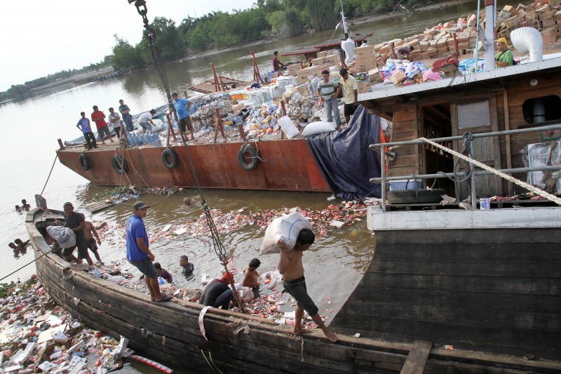 (Berita Daerah – Pekanbaru) Pekerja dibantu warga mengangkat sejumlah barang dari kapal KM Sinar Surya yang karam di salah satu pelabuhan rakyat di Sungai Siak, Pekanbaru, Riau, Senin (2/3). Kapal dengan muatan 34 ton tersebut mengangkut alat elektronik, material bangunan serta barang kebutuhan rumah tangga lainya, karam akibat pasang surut Sungai Siak.
