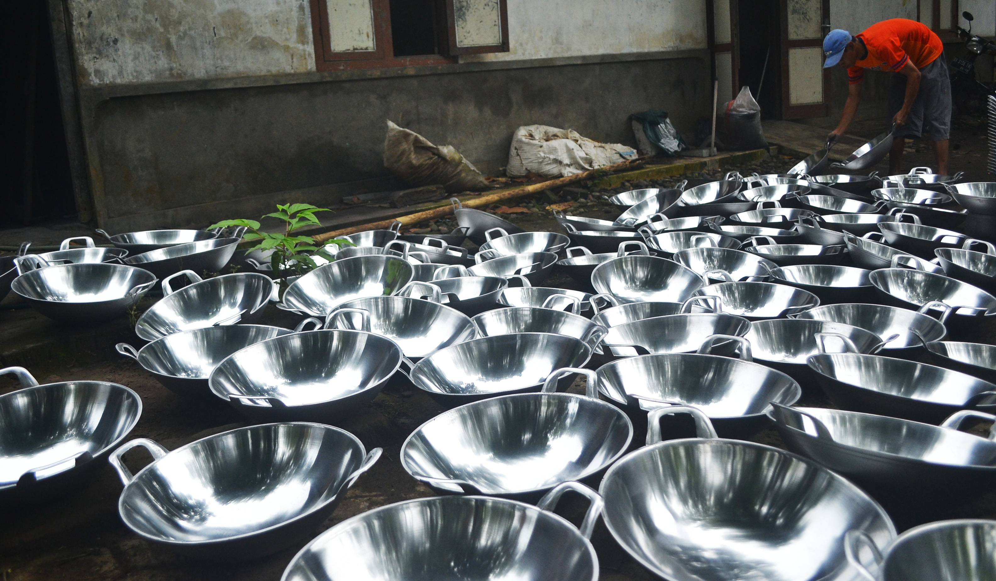 (Berita Daerah – Padang) Pekerja menjemur wajan di Putra Logam Poles Alumunium kawasan Trimurti, Srandakan, Bantul, Yogyakarta, Jumat (6/3). Jasa pemolesan wajan mampu memoles rata-rata 400 wajan per hari dengan upah Rp. 800 – Rp. 6000.