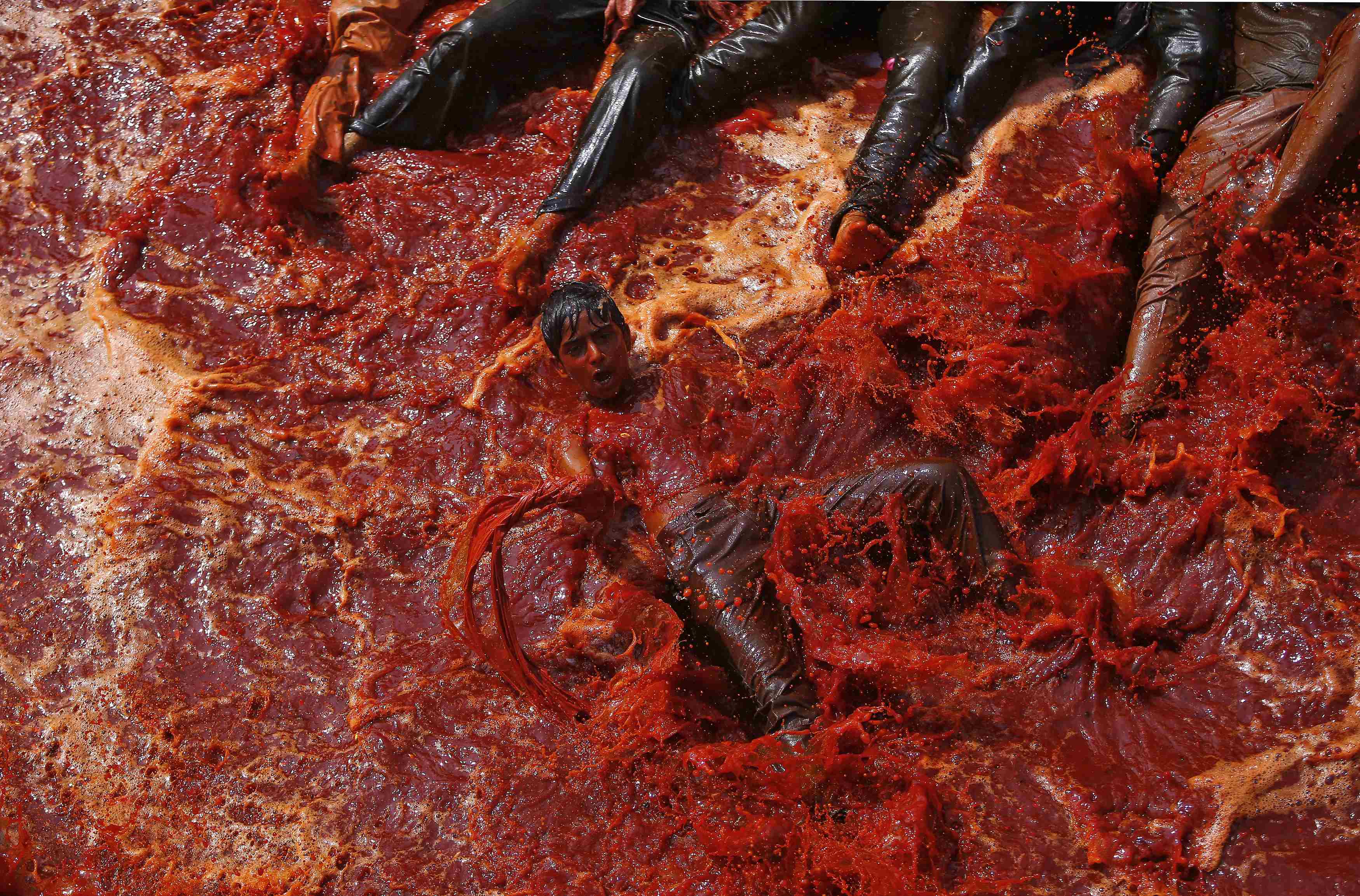 A boy lies in a puddle of coloured water during "Huranga" at Dauji temple near the northern Indian city of Mathura March 7, 2015. "Huranga" is a game played between men and women a day after Holi, the festival of colours, during which men drench women with liquid colours and women tear off the clothes of the men. REUTERS/Anindito Mukherjee (INDIA - Tags: RELIGION SOCIETY ANNIVERSARY TPX IMAGES OF THE DAY) *** Local Caption *** Seorang anak berendam di air berwarna saat "Huranga" di kuil Dauji dekat Mathura, India, Sabtu (7/3). "Huranga" adalah sebuah permainan yang dibawakan antara laki-laki dan perempuan sehari setelah Holi atau festival warna, dimana laki-laki menyiram perempuan dengan air berwarna dan perempuan merobek baju laki-laki. ANTARA FOTO/REUTERS/Anindito Mukherjee/ox/15.