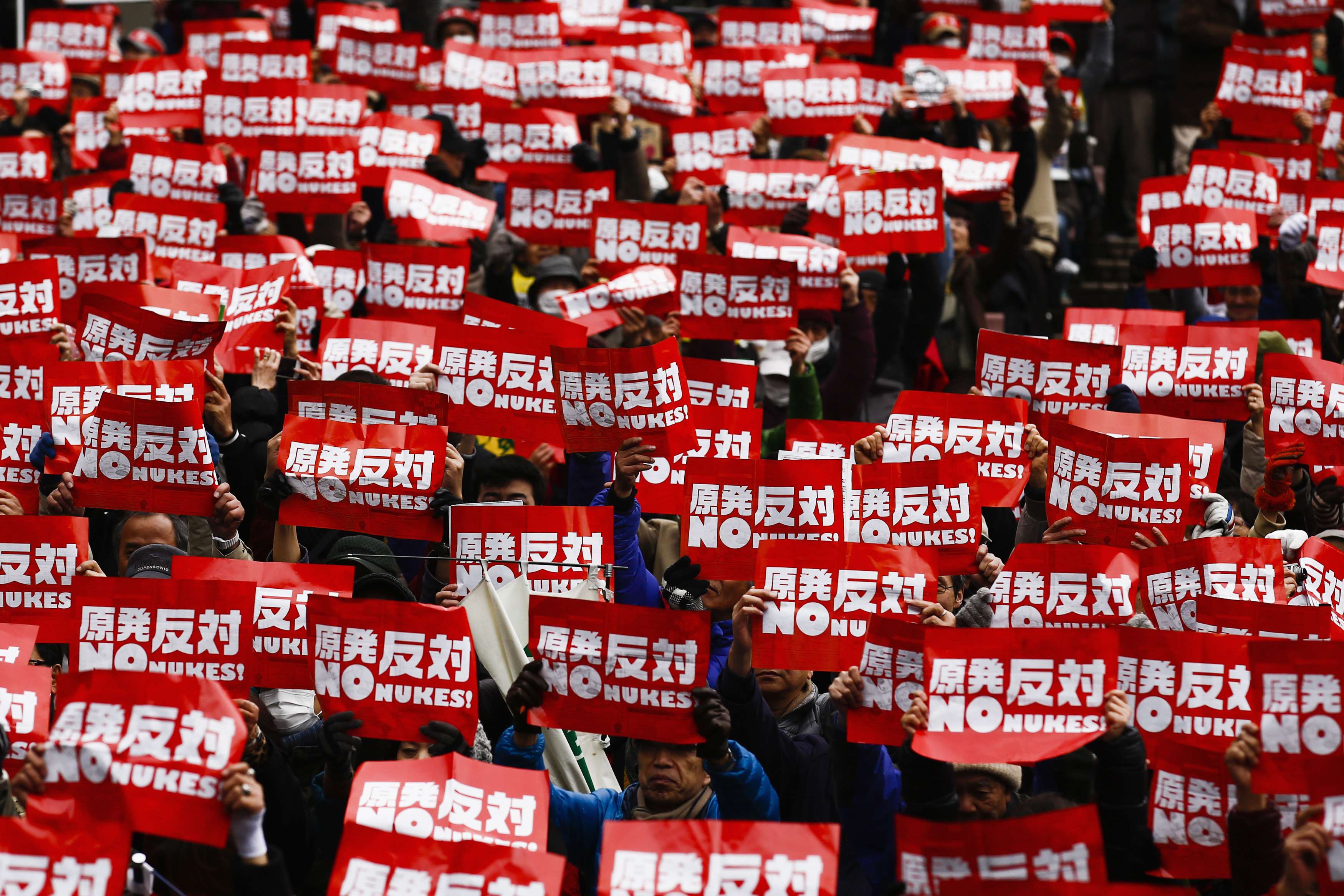 People hold placards denouncing nuclear energy during a rally in central Tokyo March 8, 2015. Anti-nuclear activists took to the streets on Sunday in Tokyo denouncing a planned restart of the country's nuclear reactors ahead of the fourth anniversary of the March 11, 2011 earthquake and tsunami disaster. REUTERS/Thomas Peter (JAPAN - Tags: CIVIL UNREST POLITICS ENERGY TPX IMAGES OF THE DAY) *** Local Caption *** Pengunjuk rasa membawa poster menentang energi nuklir saat menggelar aksi di pusat kota Tokyo, Jepang, Minggu (8/3). Aktivis anti-nuklir turun ke jalan-jalan Tokyo Minggu kemarin untuk mengecam rencana reaktivasi reaktor nuklir menjelang peringatan empat tahun bencana gempa bumi dan tsunami 11 Maret mendatang. ANTARA FOTO/REUTERS/Thomas Peter/ox/15.