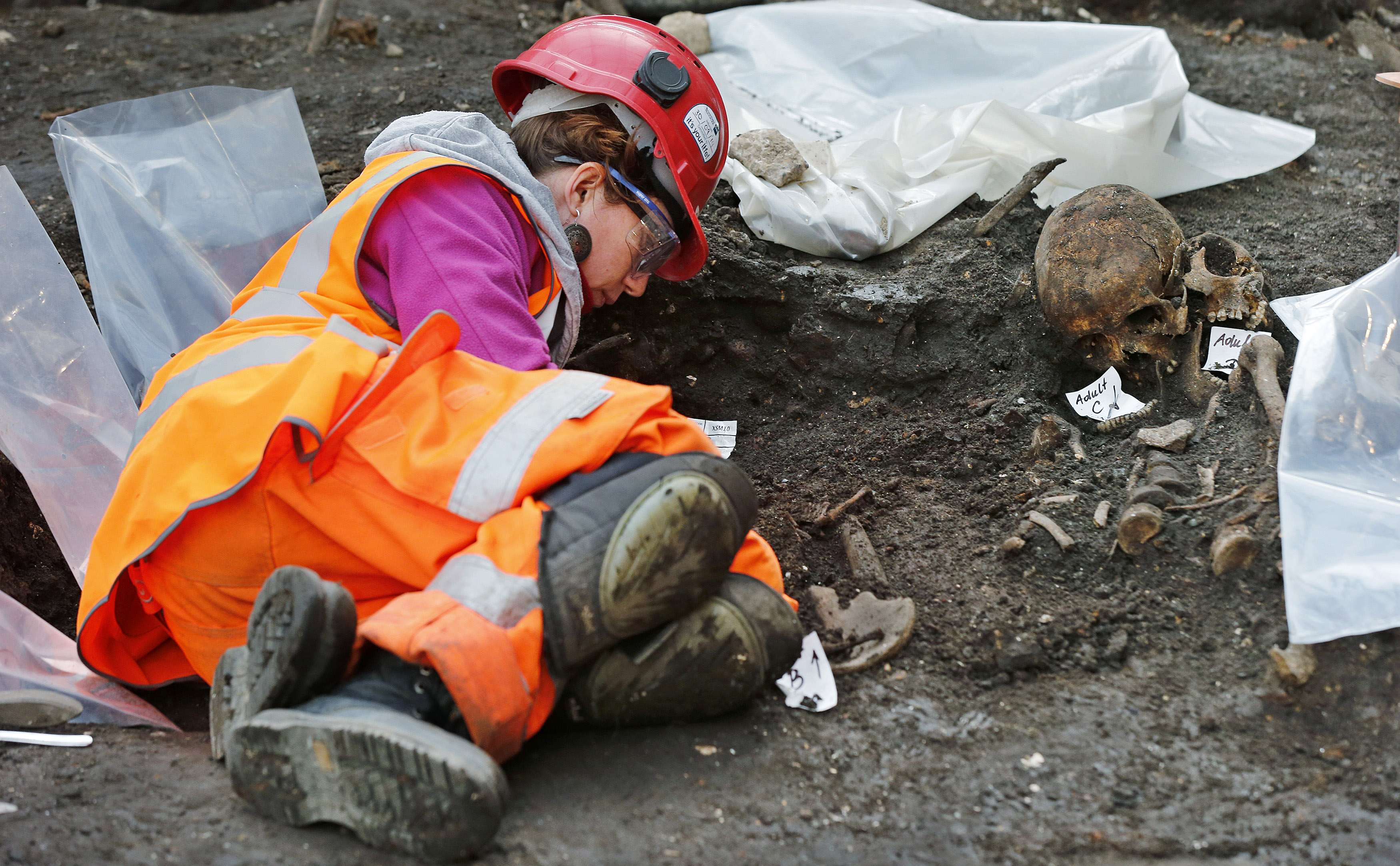 Seorang arkeolog bekerja di dekat kerangka yang ditemukan di pemakaman Bedlam di lokasi yang akan dibangun tempat penjualan tiket Crossrail di sebelah Stasiun Liverpool Street, London, Inggris, Jumat (6/3). Para arkeolog mulai melakukan ekskavasi sekitar 3.000 kerangka dari pemakaman Bedlam yang berasal dari tahun 1569 dan merupakan taman makam kota London yang pertama.