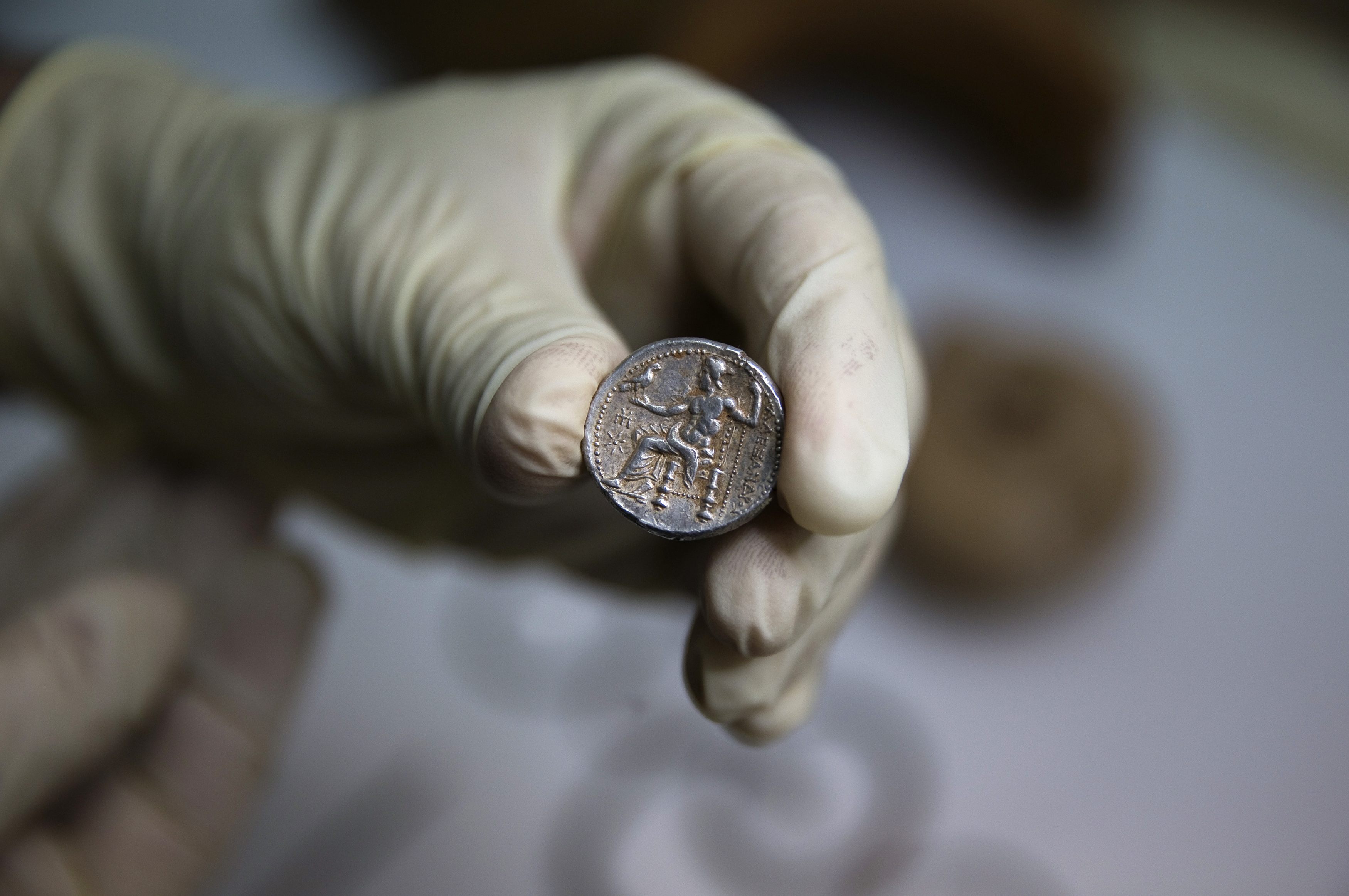 Sebuah koin dari masa Alexander Agung yang baru ditemukan diperlihatkan di Yerusalem, Israel, Senin (9/3). Penjelajah gua di Israel menemukan harta karun kecil yang berisi koin-koin dan perhiasan dari masa Alexander Agung, yang menurut para arkeolog disembunyikan oleh pengungsi saat perang. Harta karun berumur 2.300 tahun itu merupakan harta karun pertama yang ditemukan dari masa kekuasaan Alexander Agung, kata Eitan Klein dari Otoritas Barang Antik Israel.