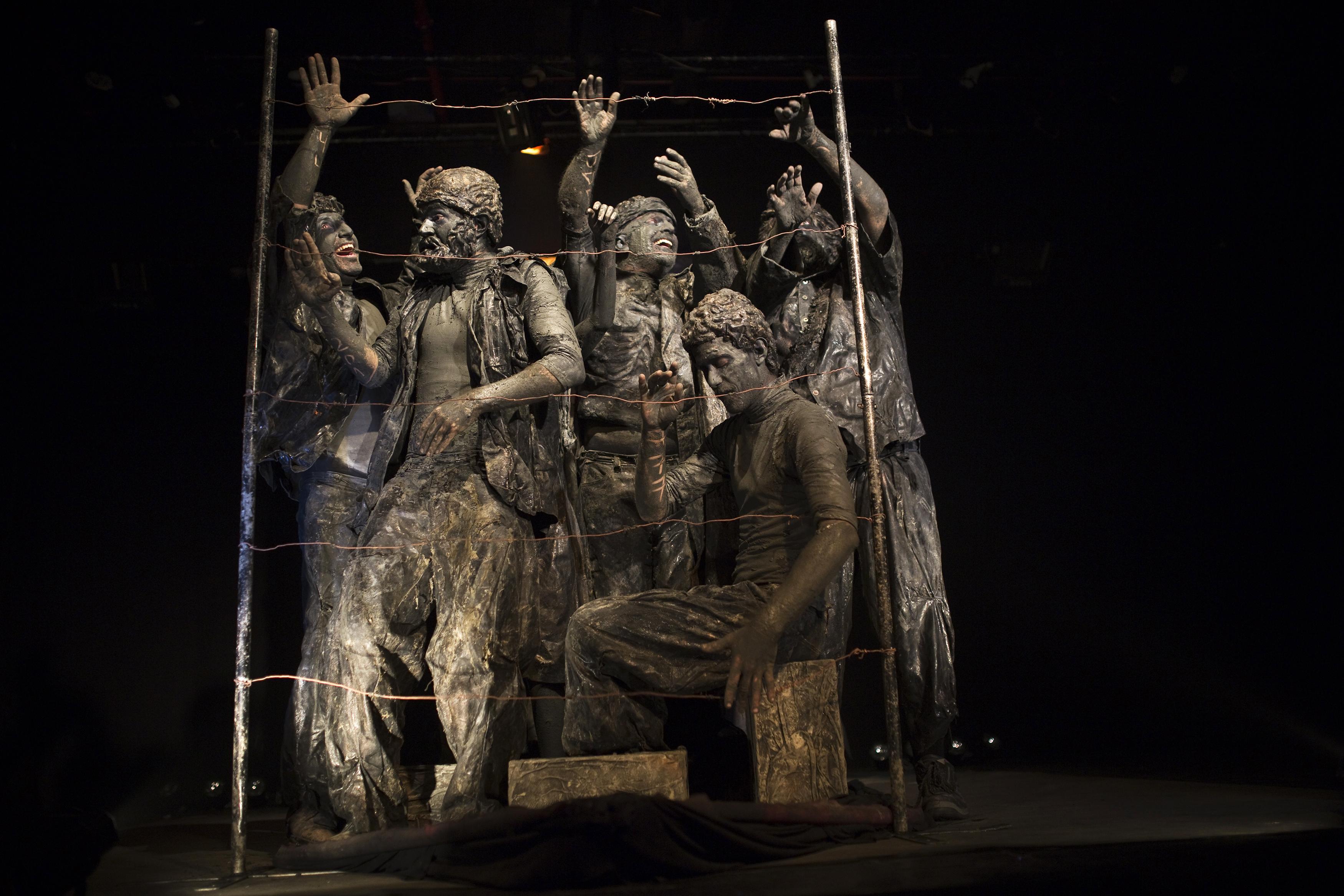 Aktor kelompok teater Orto-Da tampil dalam pertunjukan mereka berjudul “Stones” di sebuah teater di Tel Aviv, Selasa (10/3). Terinspirasi oleh Monumen Kebangkitan Kampung Yahudi di kota Warsawa milik Nathan Rapoport, drama mengisahkan cerita dari sudut pandang pahatan di monumen tersebut.