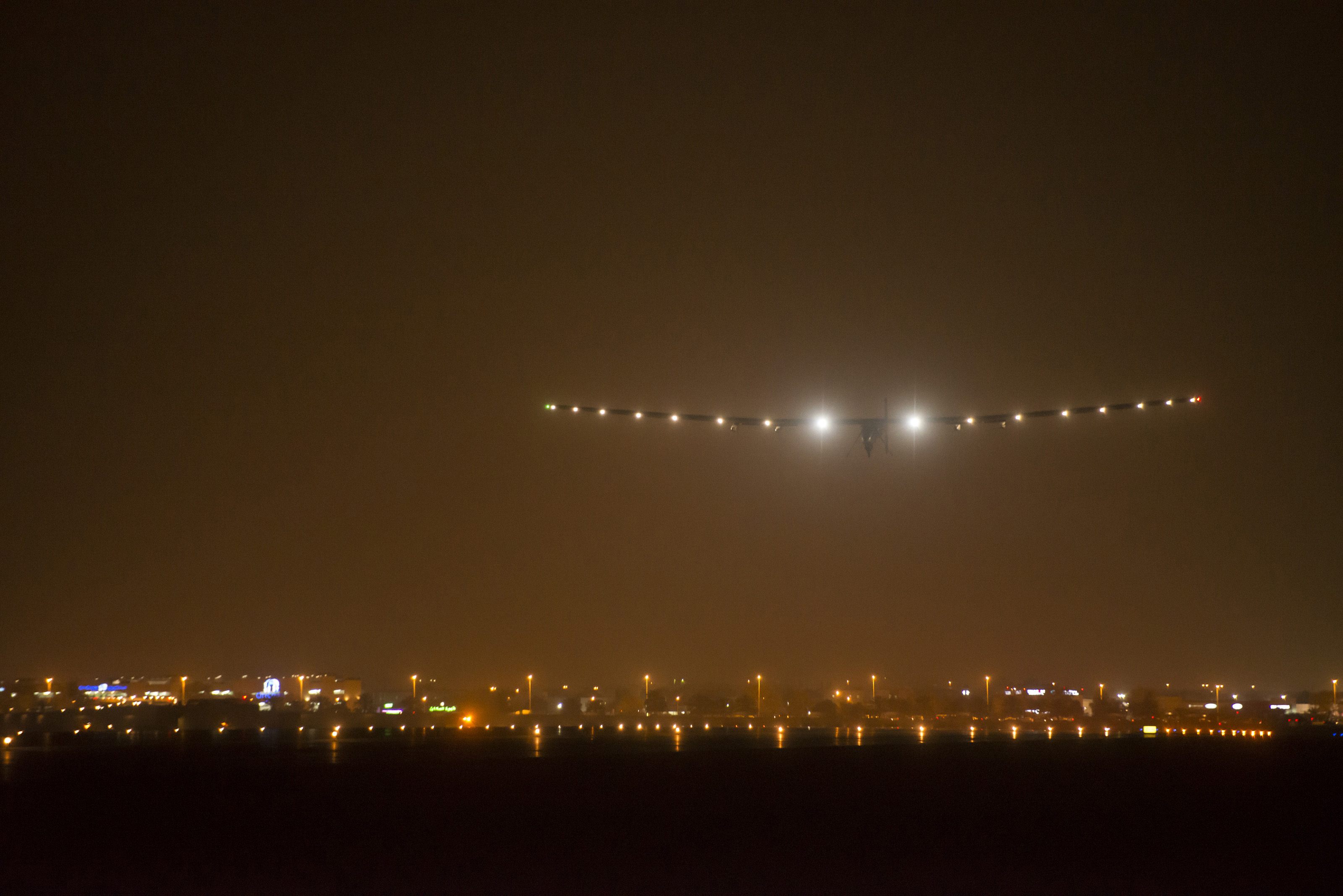 Solar Impulse 2, pesawat pertama terbang menggunakan tenaga surya, mendarat di Ahmedabad, Selasa (10/3). Pesawat tenaga surya buatan Swiss lepas landas dari Muskat di Oman Selasa pagi dan memulai etape ke dua perjalanan, upaya perdana penerbangan keliling dunia menggunakan pesawat tenaga surya untuk membuktikan terbang dapat dilakukan tanpa menggunakan bahan bakar fosil. Dalam perjalanan selama lima bulan dengan jarak 35.000 km, mesin hanya menggunakan tenaga surya. Dua pilot Swiss, Bertrand Piccard dan Andre Boschberg akan berganti alih kendali di kabin mungil selama lima hari berturut-turut di udara.