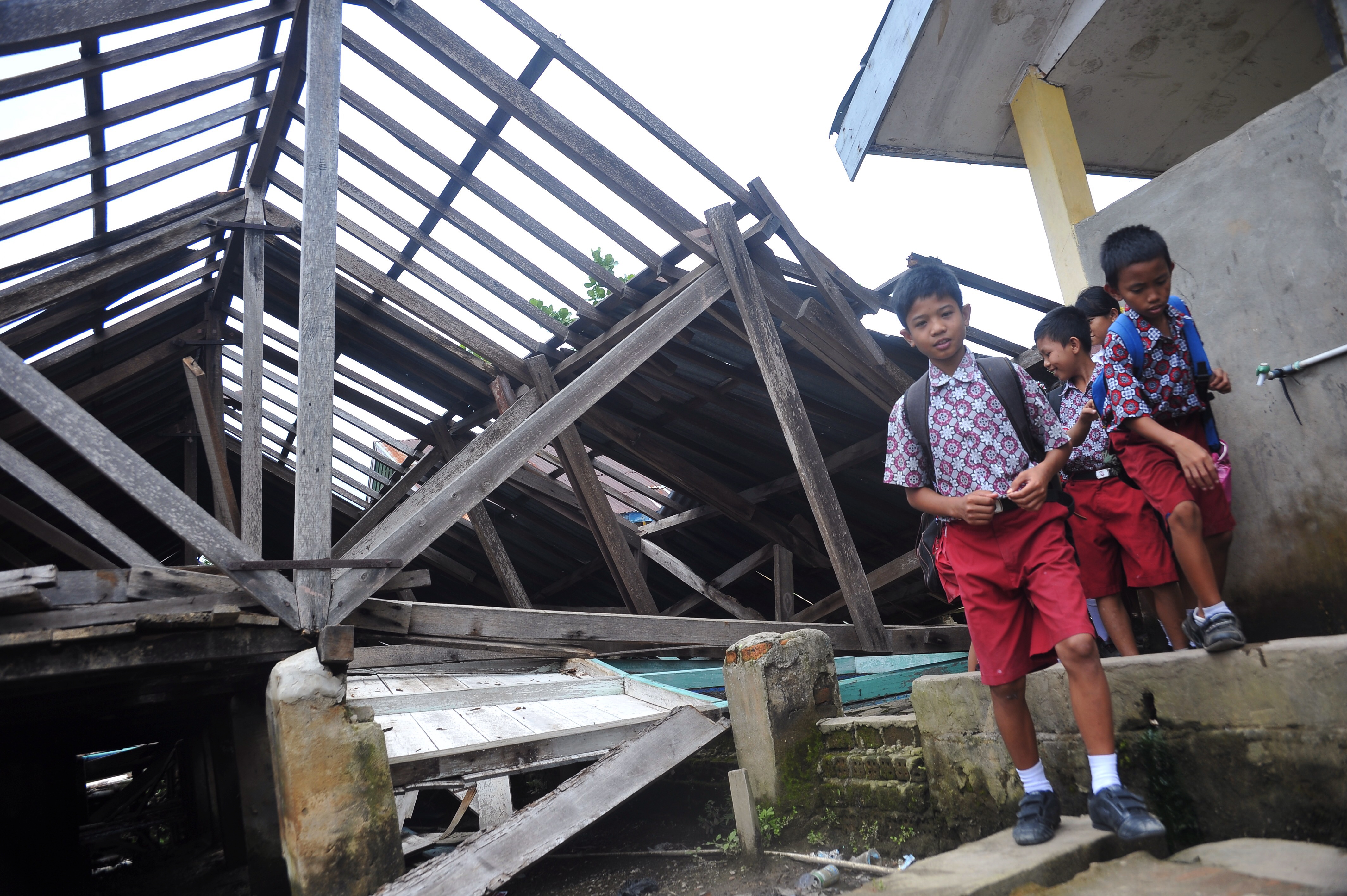 (Berita Daerah – Palembang) Sejumlah siswa SDN 242 Palembang melewati bangunan sekolahnya yang roboh akibat angin besar di Kelurahan Kramasan, Kecamatan Kertapati, Palembang, Rabu (11/3). Dinas Pendidikan dan Olahraga Kota Palembang mencatat sebanyak 65 persen gedung sekolah dasar di Palembang tergolong rusak, 30 diantaranya dikategorikan rusak berat.