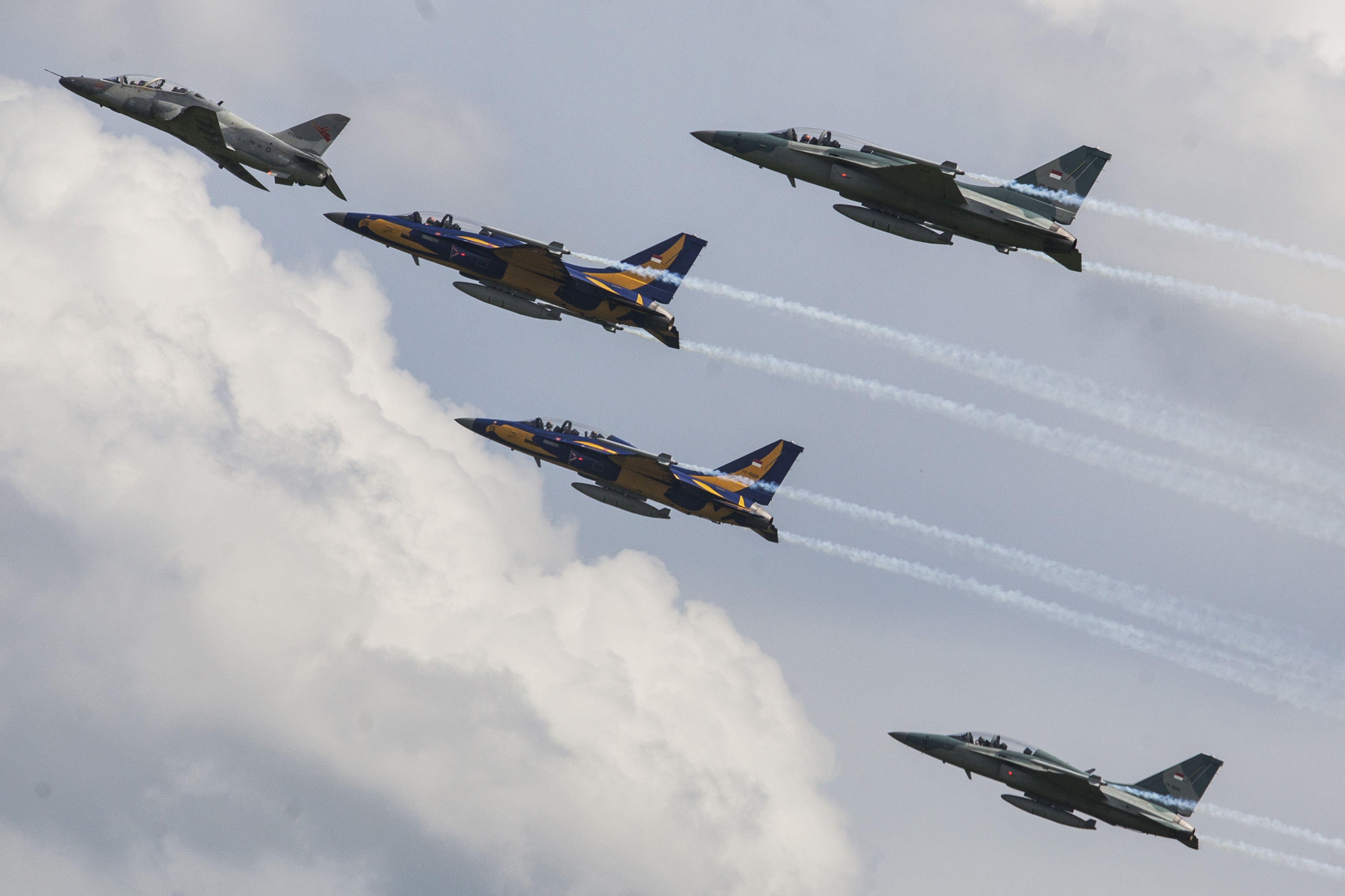 (Berita Daerah – Yogyakarta) Pesawat tempur Hawk MK-53 (kiri) dikawal empat pesawat T-50i Golden Eagle dalam upacara penyambutan penerbangan terakhir Hawk MK-53 di Lapangan Udara Adisutjipto, Yogyakarta, Kamis (12/3). Pesawat yang telah mengabdi selama 35 tahun tersebut resmi pensiun, selanjutnya akan di tempatkan di Museum Dirgantara Yogyakarta dan digantikan dengan pesawat T-50i Golden Eagle.