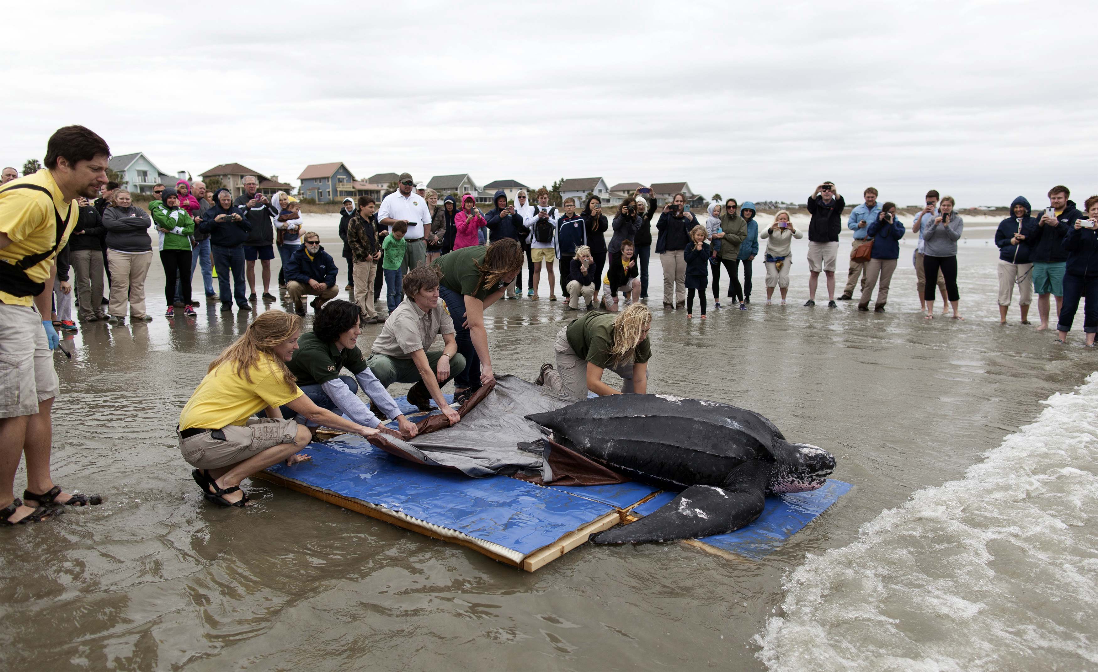 Staf dari Akuarium Carolina Selatan, Program Penyelamatan Penyu, dan Departemen Sumber Daya Alam Carolina Selatan melepaskan seekor penyu belimbing di Isla of Palms, Carolina Selatan, Amerika Serikat, Kamis (12/3). Penyu seberat 215kg itu merupakan penyu belimbing hidup pertama yang ditemukan di Carolina Selatan dan salah satu dari beberapa yang dirawat di fasilitas rehabilitasi di Amerika Serikat. Penyu tersebut ditemukan 7 Maret lalu di pantai Cagar Alam Pulau Yawkey-Selatan, pulau penghalang dan cagar satwa sepanjang 5,6km di dekat Georgetown, Carolina Selatan.