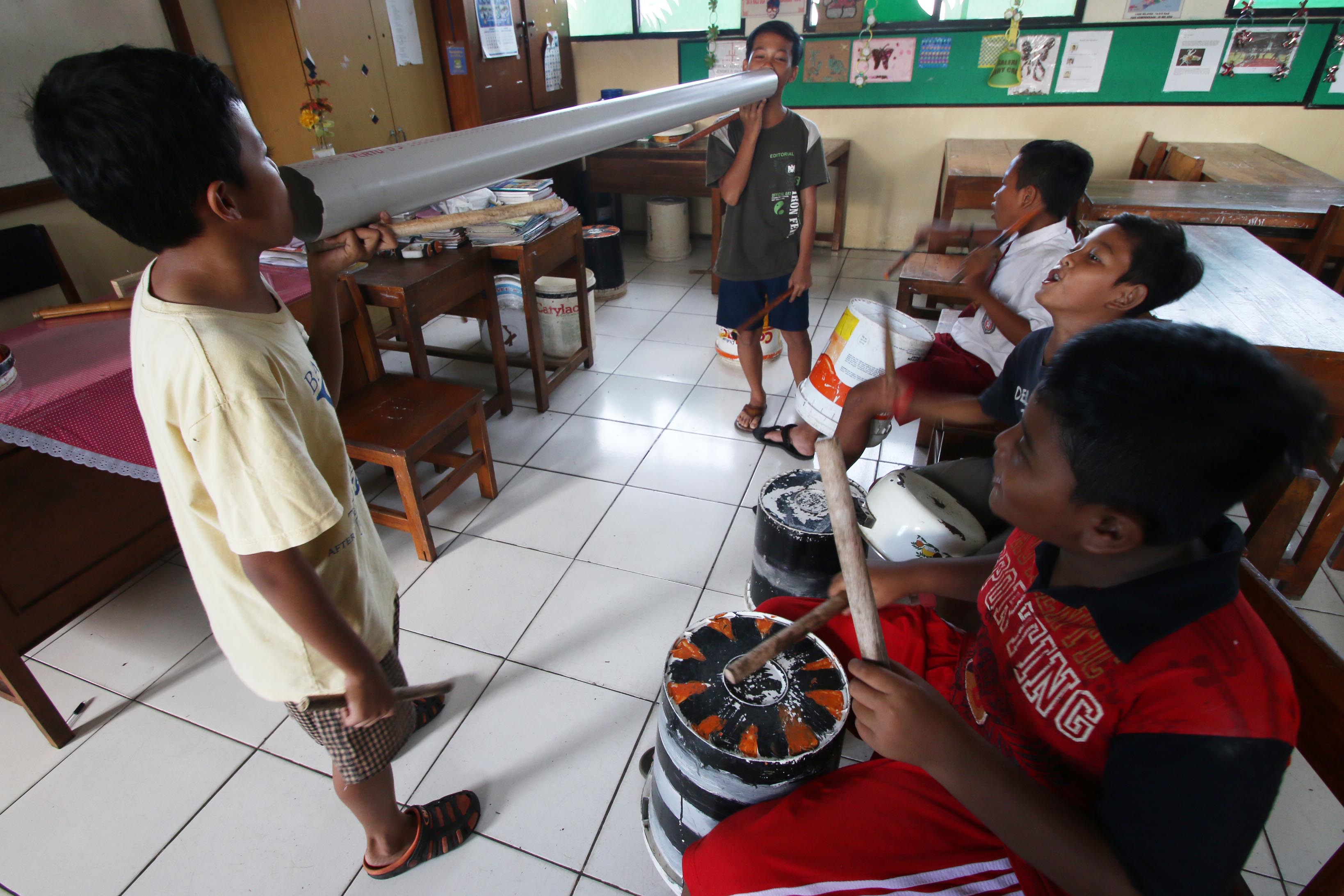 (Berita Daerah – Banten) Sejumlah siswa memainkan perkusi yang terbuat dari barang bekas di SDN 14 Tangerang, Banten, Senin (16/3). Perkusi yang terbuat dari sampah plastik, ember bekas, dan paralon bekas ini bertujuan untuk memberikan edukasi kepada anak-anak tentang bagaimana cara memanfaatkan barang bekas menjadi sebuah alat musik.