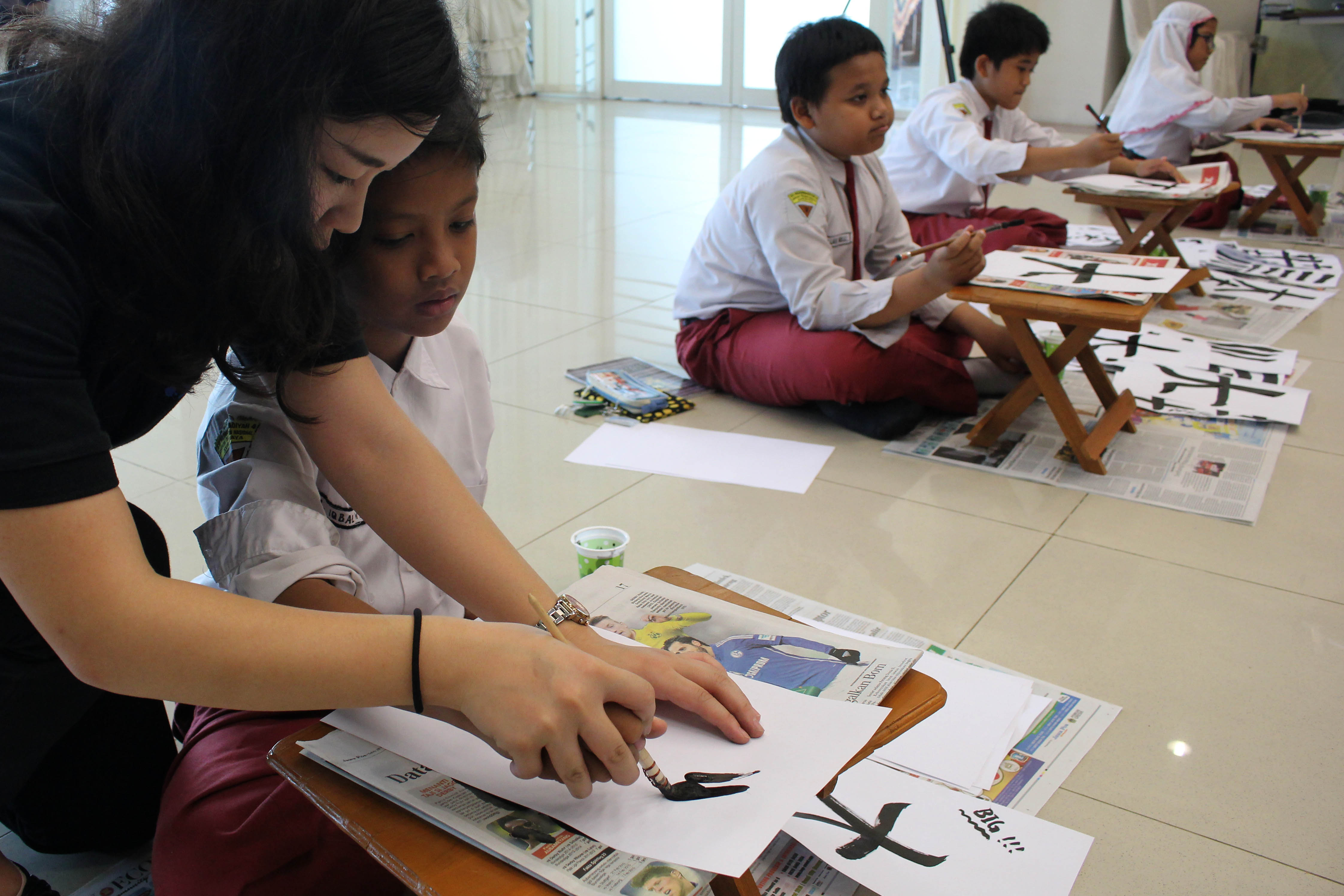 (Berita Daerah – Surabaya) Mahasiswi Meiji University of Tokyo Japan, Saki Ishiga (kiri)menuntun siswa menulis aksara Kanji di Sekolah Dasar Muhammadiyah 4 Pucang, Surabaya, Jatim, Selasa (17/3). Kegiatan tersebut dalam rangka mengenalkan budaya Jepang kepada para pelajar di Indonesia.
