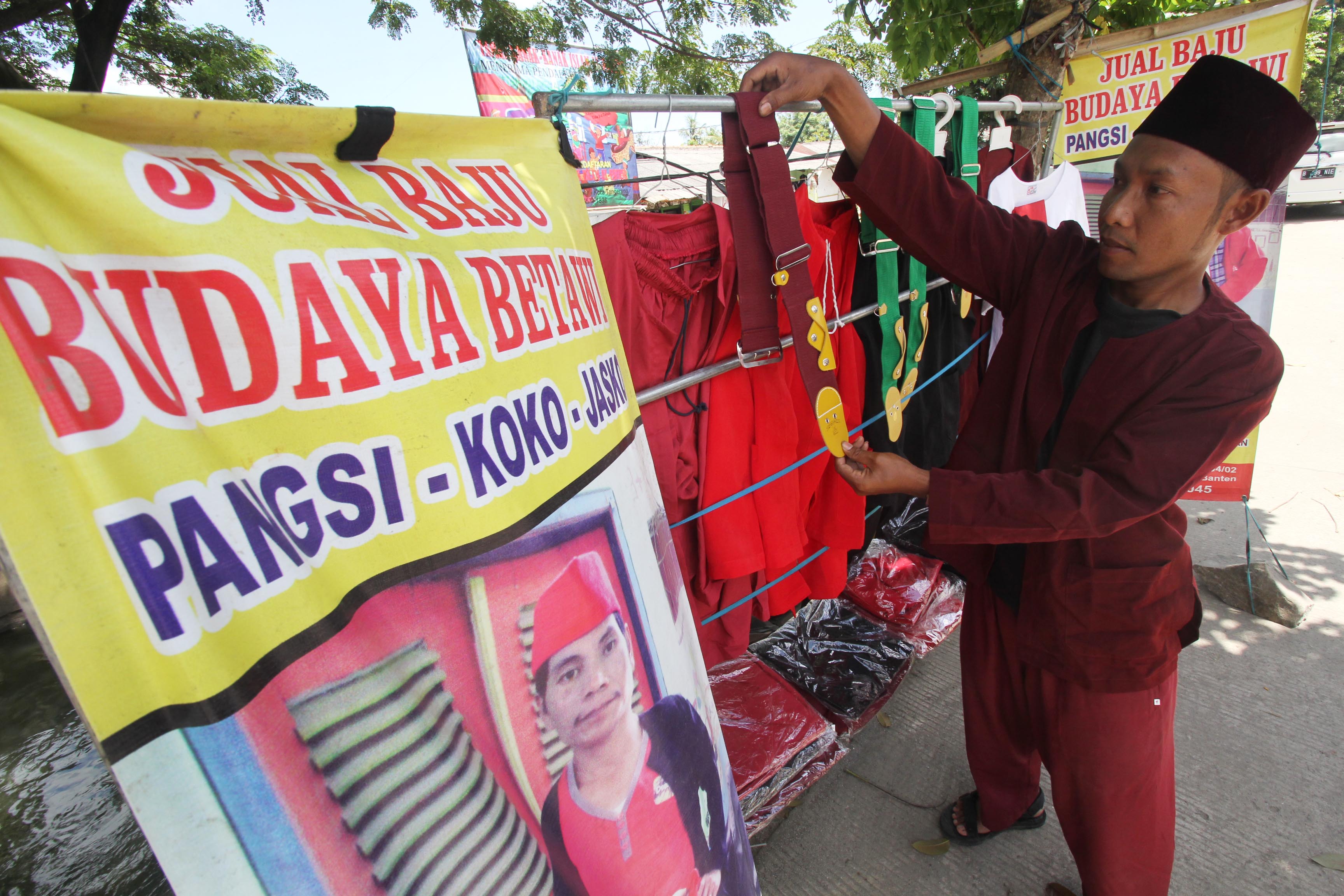 (Berita Daerah – Tengerang) Penjual merapihkan baju adat Betawi yang dijual di Cipondoh, Tangerang, Banten, Selasa (17/3). Baju khas adat Betawi itu dijual dengan kisaran harga Rp. 180 ribu – Rp. 300 ribu tergantung jenis bahan dan ukurannya.