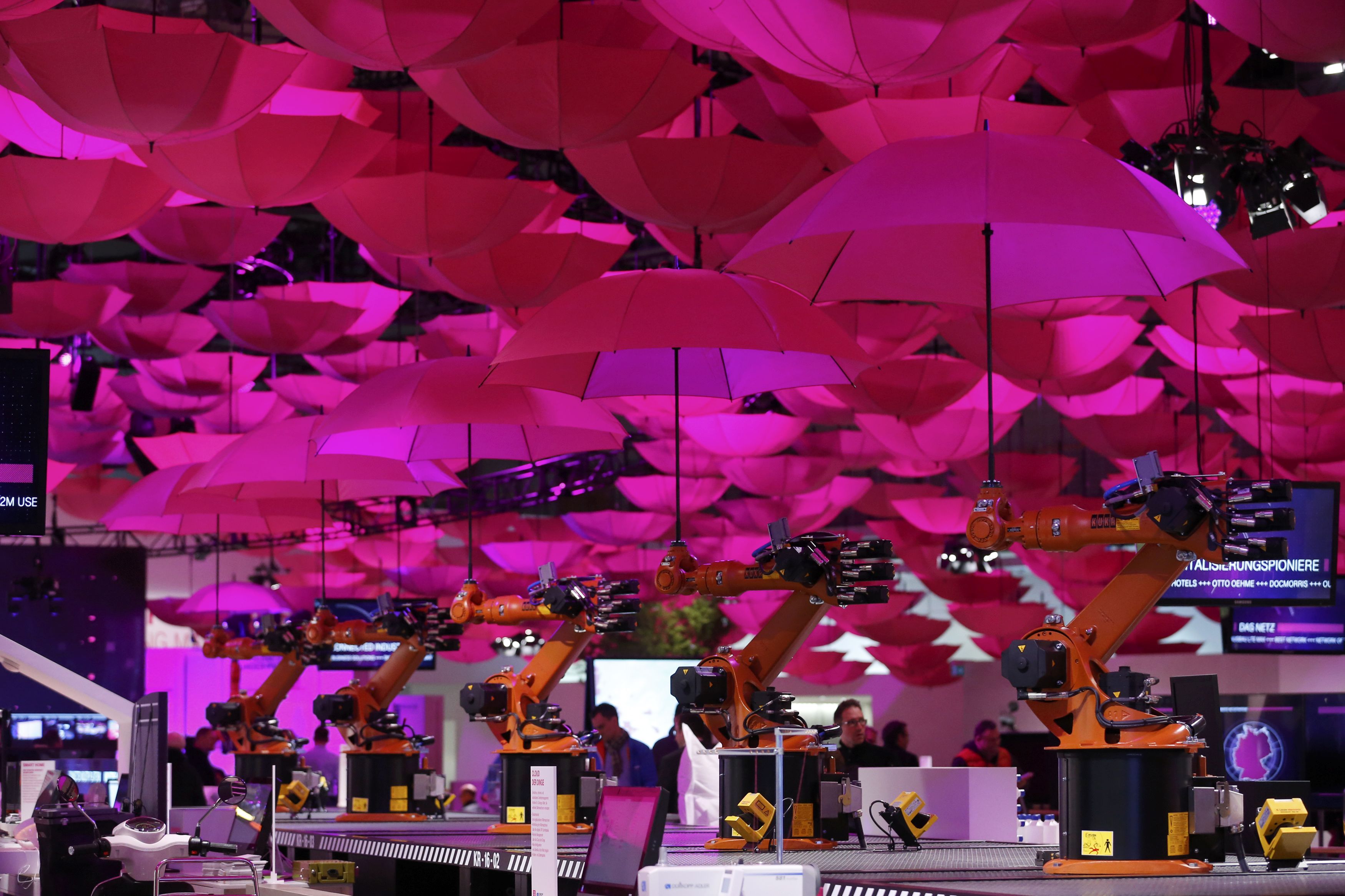 Umbrellas are held by robots produced by KUKA Robot Group, at the CeBIT trade fair in Hanover March 14, 2015. The world's biggest computer and software fair will open to the public from March 16 to 20. REUTERS/Morris Mac Matzen (GERMANY - Tags: BUSINESS SCIENCE TECHNOLOGY BUSINESS TELECOMS TPX IMAGES OF THE DAY) *** Local Caption *** Robot-robot dari KUKA Robot Group membawa payung-payung di pameran perdagangan CeBIT di Hanover, Jerman, Sabtu (14/3). Pameran komputer dan perangkat lunak terbesar di dunia itu akan dibuka untuk umum dari tanggal 16 hingga 20 Maret 2015. ANTARA FOTO/REUTERS/Morris Mac Matzen/ox/15.