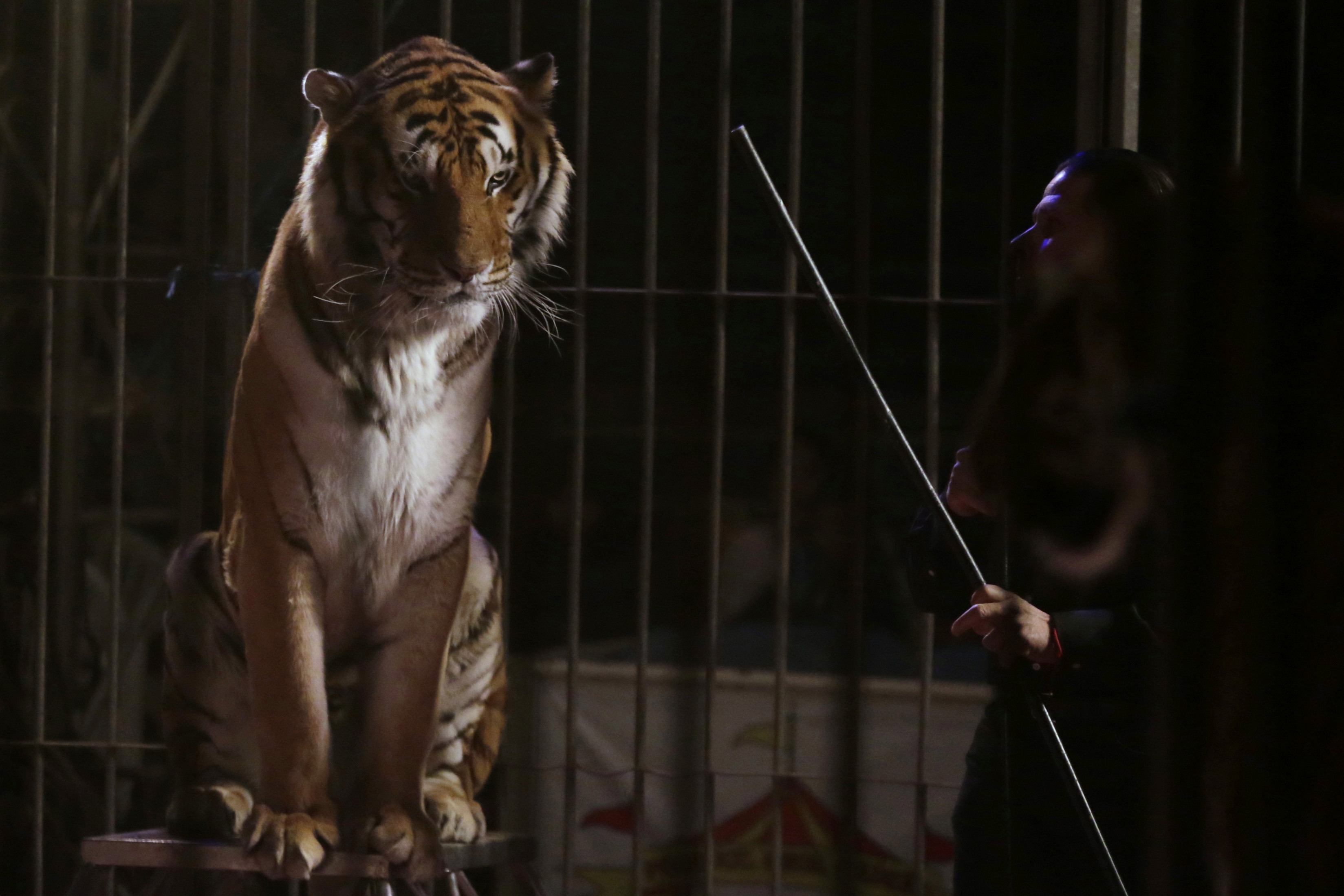 A trainer stands next to a tiger during a show at the Cedeno Hermanos Circus in Mexico City March 9, 2015. Mexico is searching for homes for at least 2,000 tigers, elephants, giraffes, zebras and other exotic beasts that will soon be banned from the country's circuses. Circus owners are worried about the fate of their animals, which they say are too expensive to keep once the ban kicks in, while government and zoo officials are grappling with a myriad of difficulties in relocating animals raised to perform tricks under the big top.The prohibition does not take effect until July 8, but many circuses have already shut down. The legislation stipulates that such animals should evolve in their natural habitat and aims to avoid animal cruelty that civil organizations have long lobbied against. Picture taken March 9, 2015. REUTERS/Henry Romero (MEXICO - Tags: SOCIETY ANIMALS TPX IMAGES OF THE DAY) *** Local Caption *** Seorang pawang berdiri di dekat seekor harimau saat pertunjukkan Sirkusi Cedeno Hermanos di Kota Meksiko, Meksiko, Senin (9/3). Meksiko mencari rumah bagi setidaknya 2.000 harimau, gajah, jerapah, zebra, dan satwa eksotik lainnya yang dalam waktu dekat akan dilarang untuk digunakan di sirkus di Meksiko. Pemilik sirkus khawatir akan nasib hewan-hewan mereka, yang menurut mereka akan terlalu mahal untuk dipelihara setelah pelarangan tersebut berlaku, sementara pemerintah dan pihak kebun binatang berjuang dengan kesulitan yang sangat besar dalam merelokasi hewan-hewan yang dibesarkan untuk tampil di sirkus. Pelarangan ini baru berlaku pada 8 Juli mendatang, namun banyak sirkus yang telah tutup. Peraturan tersebut menetapkan bahwa hewan-hewan tersebut seharusnya berkembang di habitat asli mereka dan bertujuan untuk menghindari kekejaman terhadap satawa yang telah lama ditentang oleh organisasi-organisasi sipil. ANTARA FOTO/REUTERS/Henry Romero/ox/15.