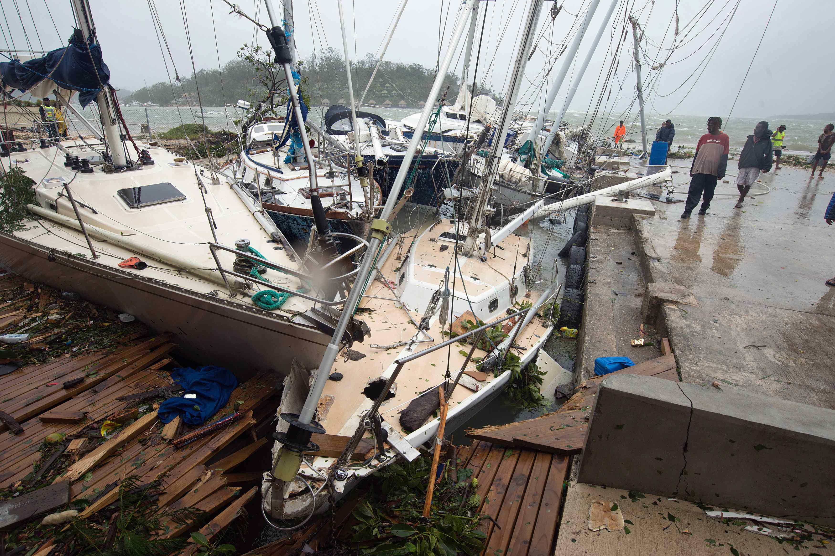 Local residents look at damaged boats against a jetty in Port Vila, the capital city of the Pacific island nation of Vanuatu March 14, 2015. Winds of up to 250 kilometers an hour (155 mph) ripped metal roofs off houses and downed trees in Vanuatu on Saturday, as relief agencies braced for a major rescue operation and unconfirmed reports said dozens had already died. Witnesses described sea surges of up to eight meters (yards) and flooding throughout the capital Port Vila after the category 5 cyclone named Pam hit the country late on Friday. REUTERS/UNICEF Pacific/Handout via Reuters (VANUATU - Tags: DISASTER ENVIRONMENT TPX IMAGES OF THE DAY) ATTENTION EDITORS - THIS PICTURE WAS PROVIDED BY A THIRD PARTY. REUTERS IS UNABLE TO INDEPENDENTLY VERIFY THE AUTHENTICITY, CONTENT, LOCATION OR DATE OF THIS IMAGE. FOR EDITORIAL USE ONLY. NOT FOR SALE FOR MARKETING OR ADVERTISING CAMPAIGNS. THIS PICTURE IS DISTRIBUTED EXACTLY AS RECEIVED BY REUTERS, AS A SERVICE TO CLIENTS. NO SALES. NO ARCHIVES *** Local Caption *** Warga melihat kerusakan perahu yang menabrak dermaga di Port Villa, ibukota kepulauan Pasifik Vanuatu, Sabtu (14/3). Angin dengan kecepatan 250 kilometer per jam memporakporandakan atap baja rumah-rumah dan merubuhkan pepohonan di Vanuatu hari ini, saat badan keselamatan mengadakan operasi penyelamatan besar-besaran dan laporan sementara mengatakan sejumlah jiwa tewas. Saksi menceritakan gelombang laut mencapai ketinggian delapan meter dan banjir di seluruh ibukota Port Villa setelah siklon Pam kategori 5 melanda kota mereka. ANTARA FOTO/REUTERS/UNICEF Pacific/Handout via Reuters /djo/15