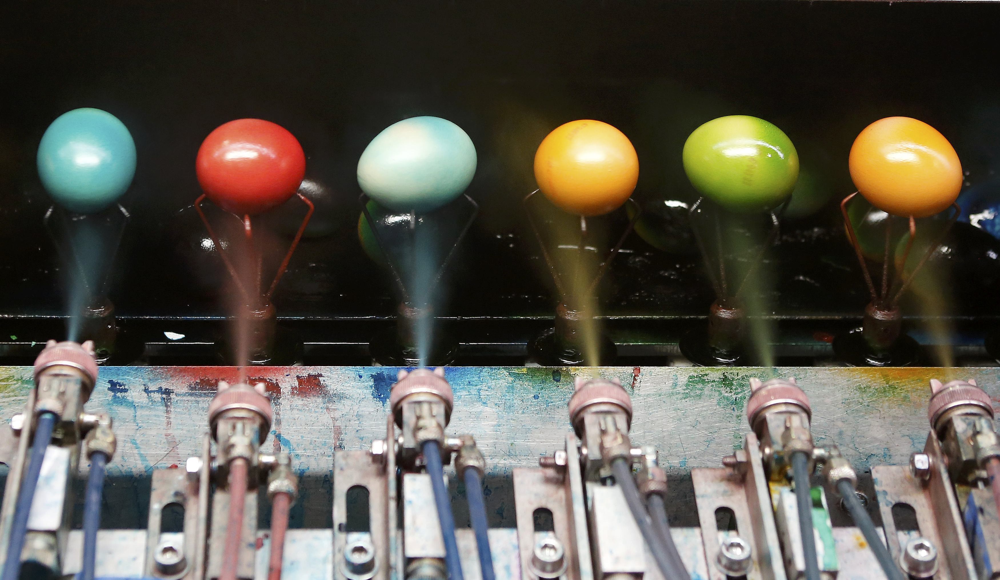 Cooked eggs are coloured on the production line at the Schrall coloured eggs company in the Austrian Village of Diendorf March 16, 2015. Schrall is one of Austria's biggest Easter and coloured eggs producers and makes between eight and 10 million coloured eggs throughout year. REUTERS/Leonhard Foeger (AUSTRIA - Tags: FOOD BUSINESS TPX IMAGES OF THE DAY) *** Local Caption *** Telur rebus yang diberi warna terlihat di lini produksi perusahaan telur warna Schrall di Diendorf, Austria, Senin (16/3). Schrall merupakan salah satu produsen telur warna dan telur Paskah terbesar di Austria, memproduksi antara delapan hingga sepuluh juta telur warna selama setahun. ANTARA FOTO/REUTERS/Leonhard Foeger/ox/15.