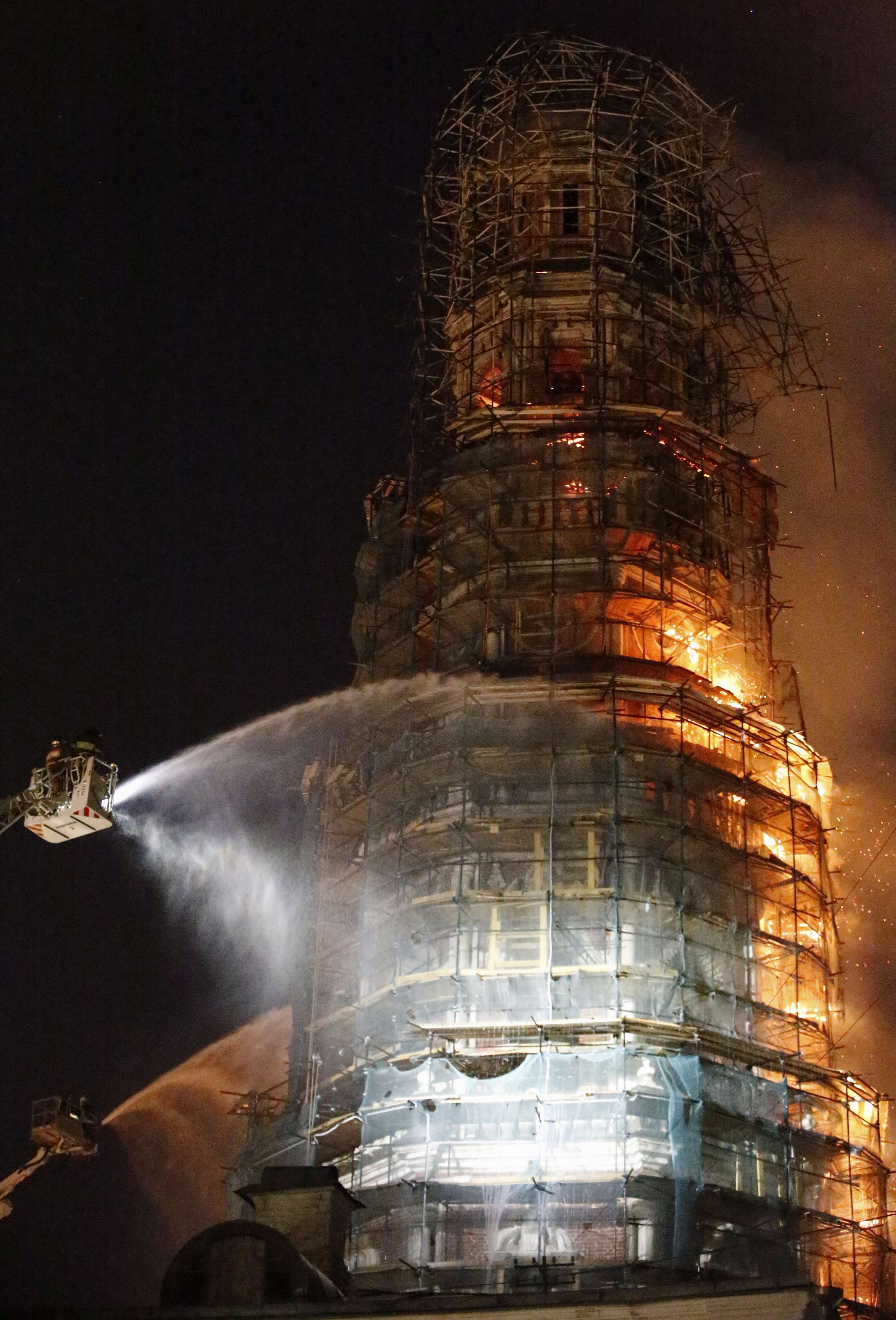 Firefighters work to extinguish a fire at the bell tower of Novodevichy monastery, a UNESCO World Heritage site, in Moscow March 15, 2015. REUTERS/Tatyana Makeyeva (RUSSIA - Tags: DISASTER RELIGION TRAVEL TPX IMAGES OF THE DAY) *** Local Caption *** Petugas pemadam kebakaran berusaha memadamkan api yang melalap menara lonceng biara Novodevichy, salah satu situs Warisan Dunia UNESCO, di Moskow, Rusia, Minggu (15/3). ANTARA FOTO/REUTERS/Tatyana Makeyeva/ox/15.