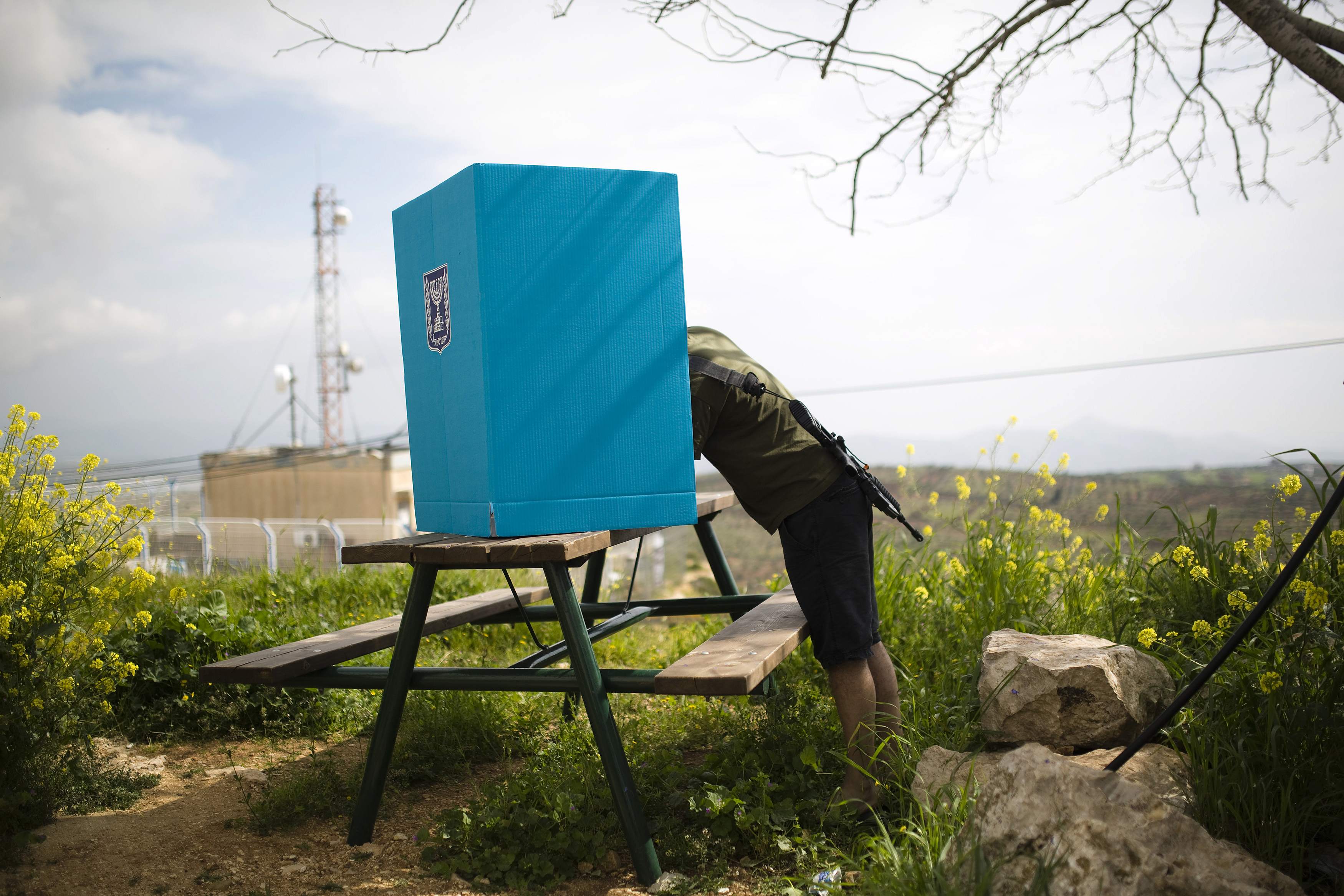 Seorang tentara Israel membrikan hak suaranya dalam pemilihan parlemen dibalik boks pemilu bergerak di pemukiman Yahudi Migdalim, dekat Ariel, Tepi Barat, Selasa (17/3). Jutaan warga Israel memberikan suara mereka pada hari Selasa dalam pemilu dengan persaingan ketat, dengan Perdana Menteri Benjamin Netanyahu menghadapi perjuangan berat mengalahkan kampanye hebat oleh oposisi tengah-kiri agar ia tidak kembali menjabat untuk keempat kalinya.