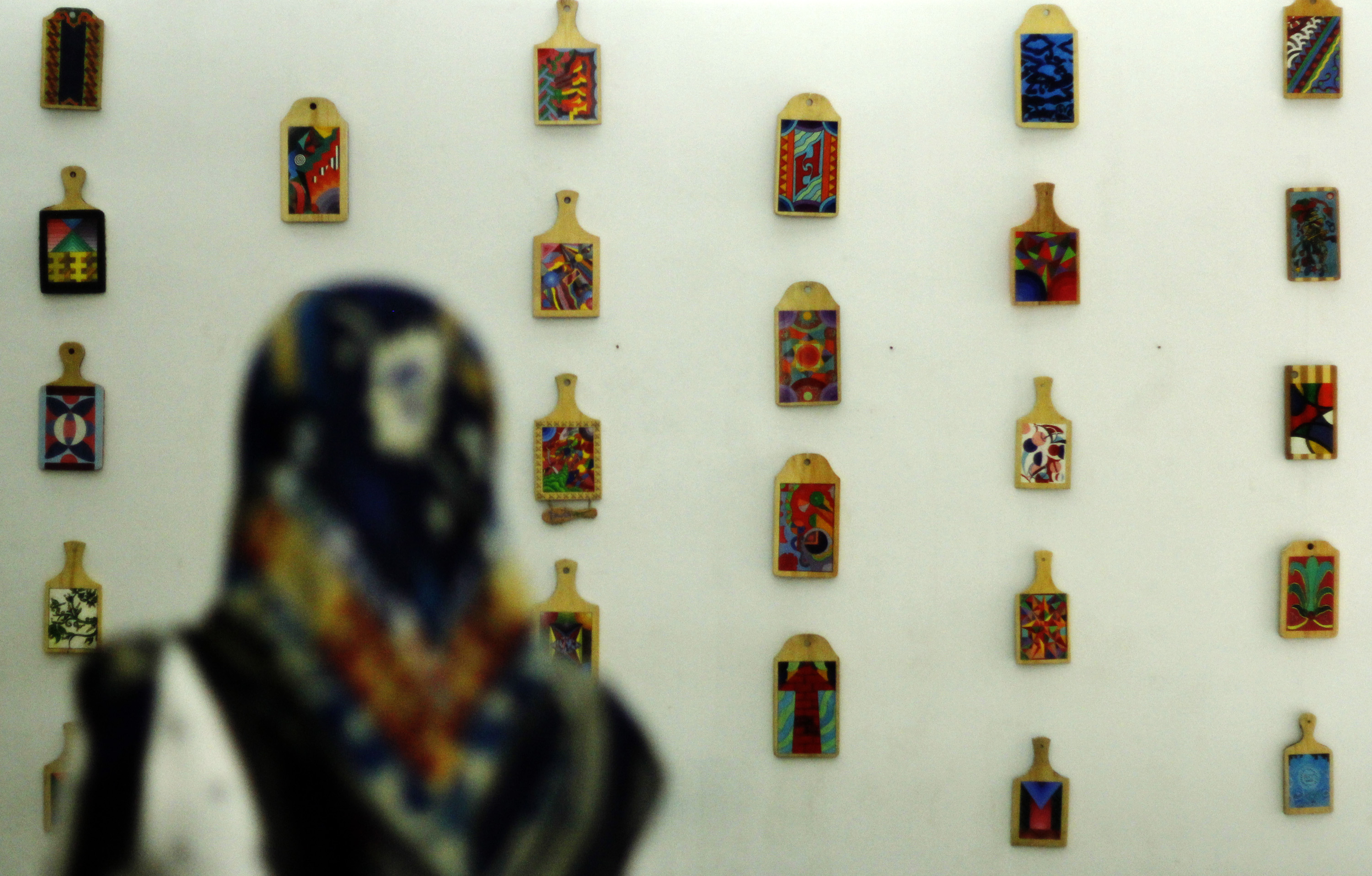 (Berita Daerah – Makassar) Pengunjung memperhatikan karya seni nirmana yang dipamerkan di Rumata Art Space Makassar, Sulawesi Selatan, Senin (23/3). Pameran karya seni rupa hasil karya mahasiswa Universitas Muhammadiyah (Unismuh) Makassar tersebut memamerkan sejumlah karya seni nirmana yang menggunakan media alat-alat rumah tangga seperti cobekan, guci, dan talenan.