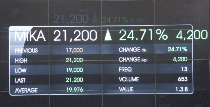 Memulai perdagangan perdananya di lantai bursa, saham PT Mitra Keluarga Karya Sehat Tbk (MIKA) dalam 2 sesi perdagangan kemarin (24/3) berhasil mencetak kenaikan harian hingga 24,71 persen atau alami kenaikan 4,200 poin menjadi Rp21.200 per lembar saham. Saham perseroan sempat menyentuh posisi terendah yakni Rp19.000 per saham, dan posisi tertinggi Rp23.675 per saham. Mitra Keluarga Karyasehat merupakan emiten kedua di 2015 atau ke 507 di Bursa Efek Indonesia (BEI).