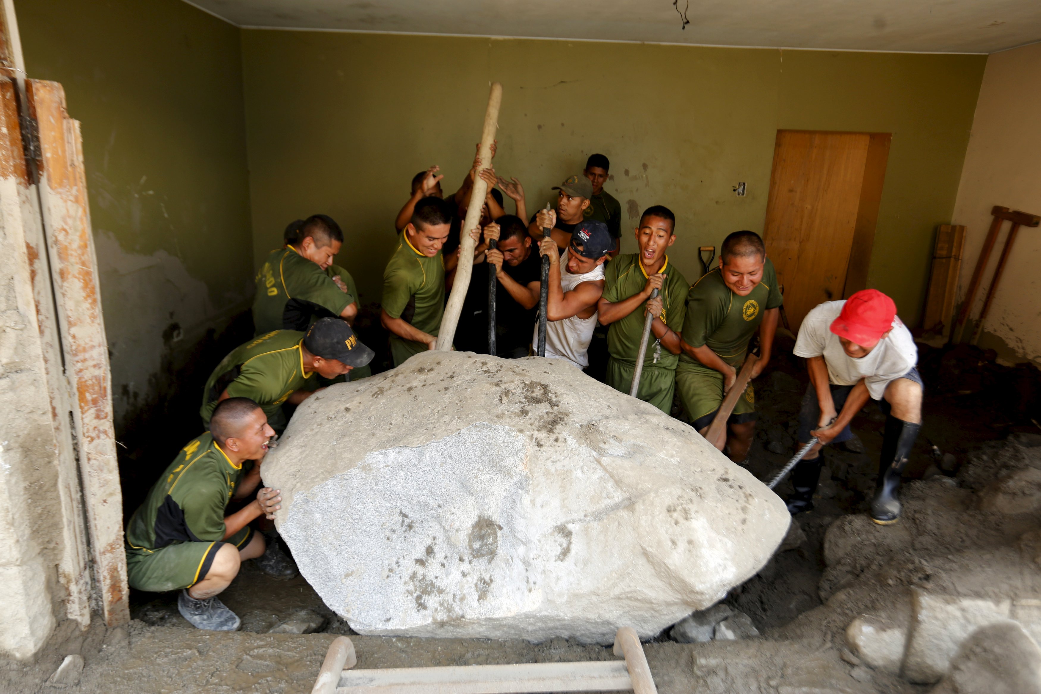 Tentara militer Peru berusaha mengeluarkan batu besar dari sebuah rumah di Miguel Grau, Chosica, Peru, Kamis (26/5) setelah longsor melanda daerah tersebut. Tujuh orang tewas dan dikhawatirkan jumlah korban jiwa akan terus bertambah setelah longsor mengubur beberapa bagian kota tersebut di tengah hujan deras, kata pihak berwenang Selasa lalu. Warga Miguel Grau di Chosica yang dibantu oleh tentara dan polisi mulai membersihkan lumpur dan batu dari rumah mereka setelah longsor. Beberapa orang masih tinggal di rumah mereka namun beberapa lainnya telah dievakuasi.