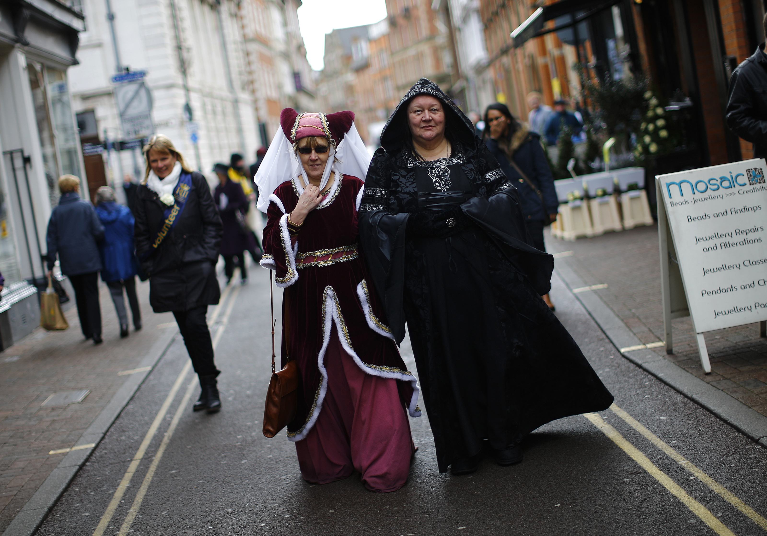 Warga dengan kostum abad pertengahan berjalan usai misa penguburan kembali Raja Richard III di Katedral Leicester, Inggris, Kamis (26/3). Raja Richard III, yang berkuasa di Inggris pada abad pertengahan dan sisa jenazzahnya ditemukan di bawah sebuah lapangan parkir tiga tahun lalu, dimakamkan ulang Kamis kemarin, hampir 530 tahun setelah ia tewas dalam perang.