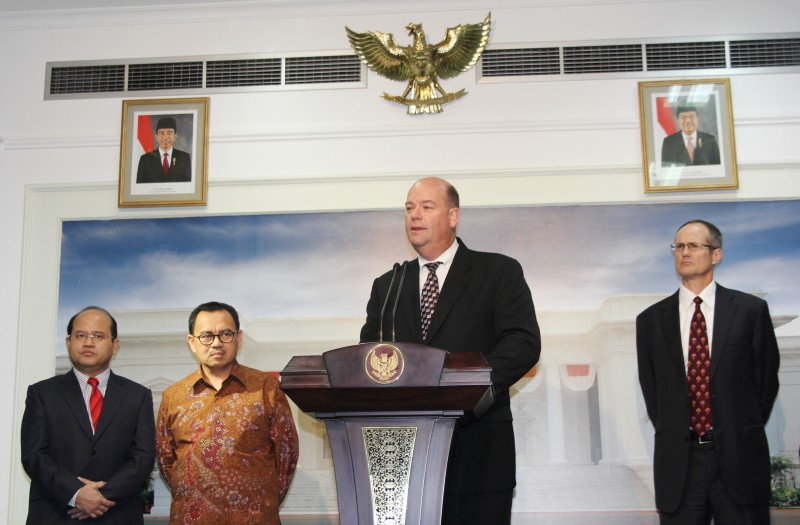 (Vibizmedia – Nasional) Indonesia mendapatkan apresiasi dari Conoco Philips yang merupakan perusahaan energi multinasional yang berkantor pusat di Texas Amerika Serikat, siang ini Selasa (31/3) delegasi dari Conoco Philips datang ke kantor Istana Presiden bertemu dengan Presiden Jokowi yang didampingi oleh Menteri ESDM Sudirman Said diantaranya Chairman & CEO Conoco Philips Ryan Lance dan President & GM Conoco Philips Indonesia Erec Isaacson.
