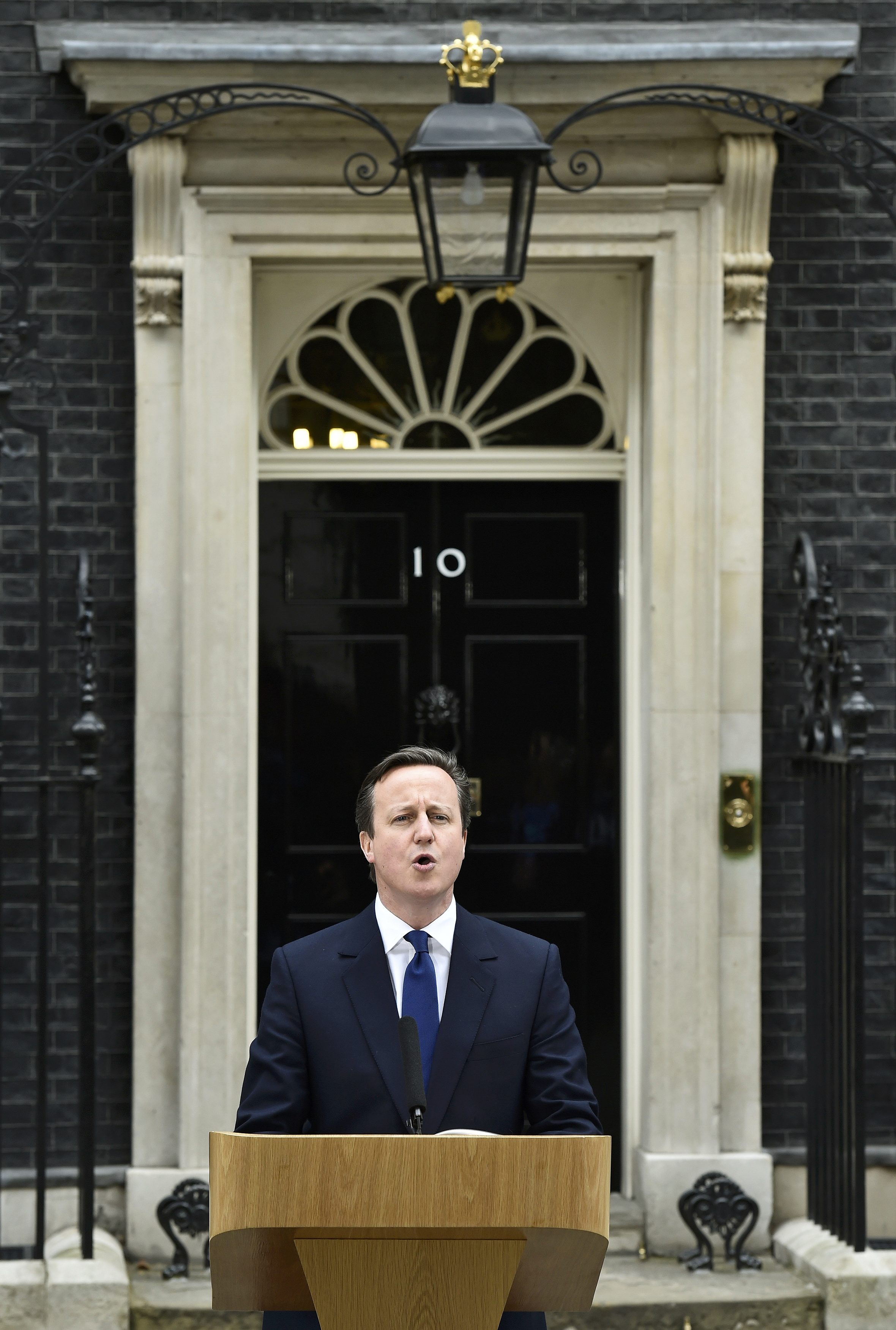 Britain's Prime Minister David Cameron speaks as he returns to Number 10 Downing Street, after meeting with Queen Elizabeth at Buckingham Palace in central London March 30, 2015. Campaigning in Britain's closest national election in decades started on Monday after Cameron meet Queen Elizabeth following parliament's dissolution, teeing up an unusually fraught battle to govern the $2.8 trillion economy. REUTERS/Toby Melville TPX IMAGES OF THE DAY *** Local Caption *** Perdana Menteri Inggris David Cameron berpidato saat ia kembali ke kantornya di Downing Street No.10 usai bertemu Ratu Elizabeth di Istana Buckingham, London, Inggris, Senin (30/3). Masa kampanye pemilu Inggris dimulai Senin kemarin setelah Cameron bertemu Ratu Elizabeth usai pembubaran parlemen, memulai perseteruan yang diwarnai ketegangan untuk memerintah ekonomi sebesar 2,8 triliun dolar. ANTARA FOTO/REUTERS/Toby Melville/ox/15.