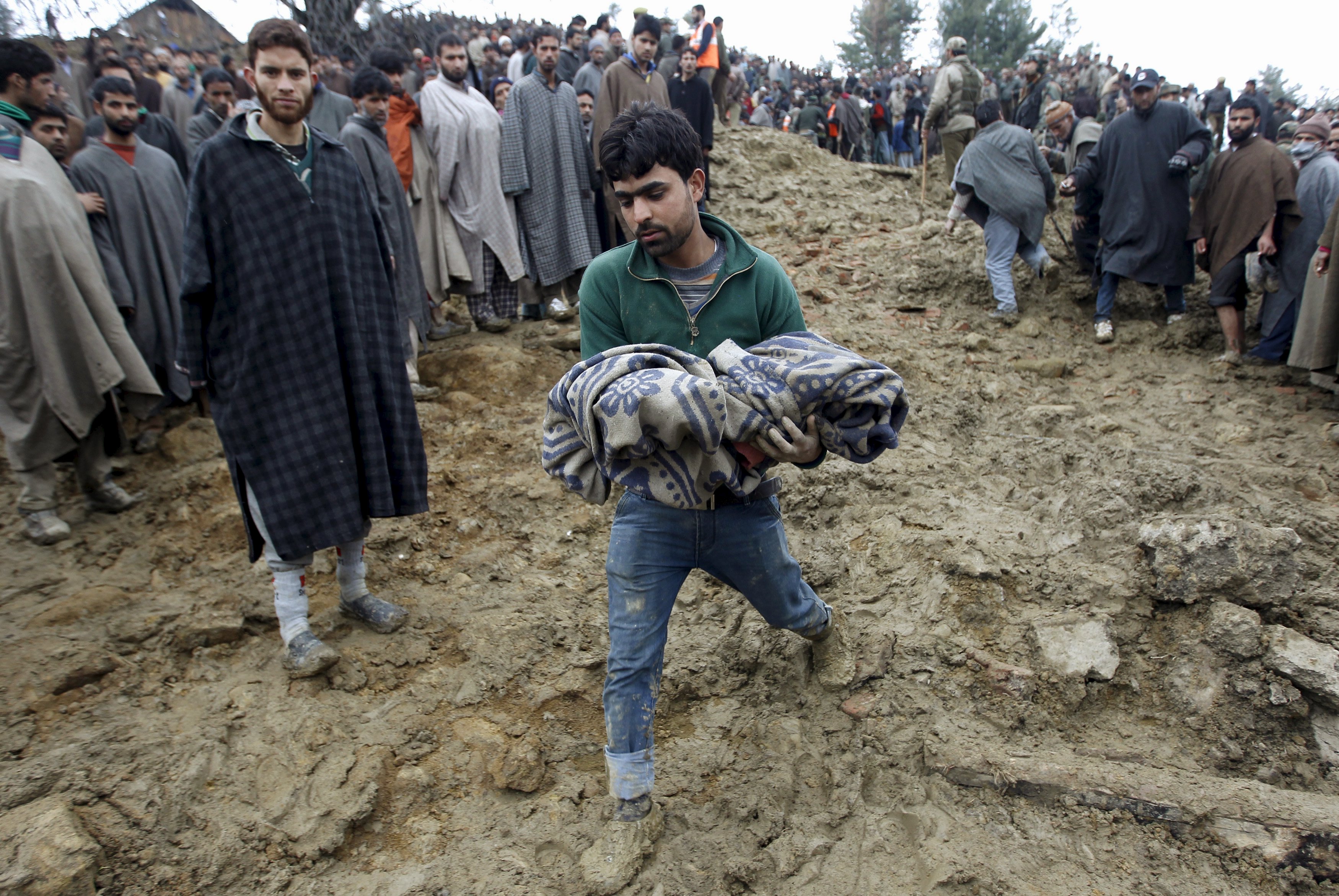 A man carries the body of a child after it was pulled out from the rubble after a hillside collapsed onto a house at Laden village, west of Srinagar, March 30, 2015. A landslide in the Himalayan region of Kashmir killed six people and left 10 missing, police said on Monday, as unseasonal rains swept India, damaging crops and raising fears of flash floods in the mountainous north. REUTERS/Danish Ismail