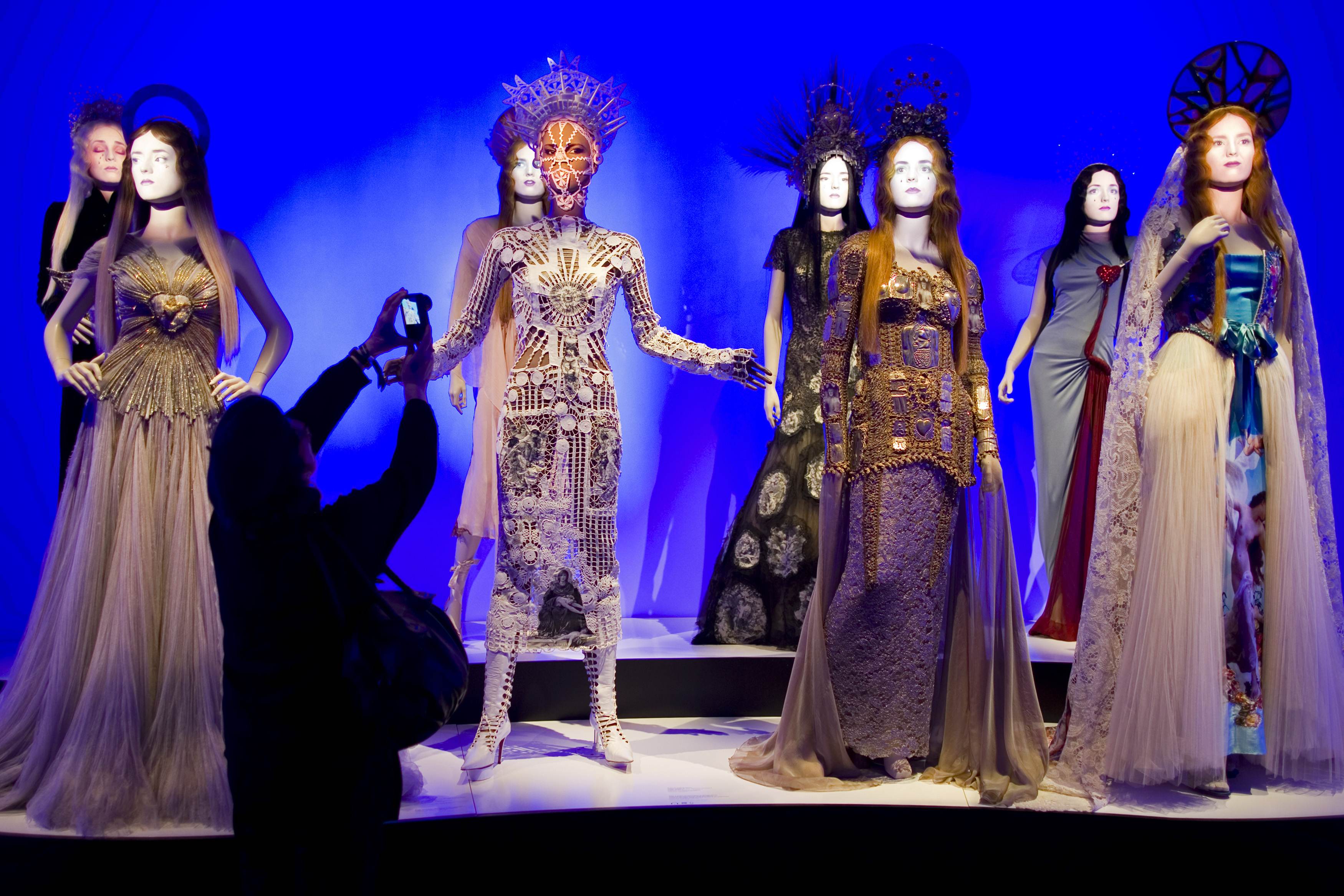 A visitor takes pictures of creations during the press visit of the Jean Paul Gaultier Exhibition at the Grand Palais in Paris, March 30, 2015. The Jean Paul Gaultier fashion exhibition, which will take place from April 1 to August 3, 2015, will present 175 Haute Couture and ready-to-wear outfits designed between 1976 and 2015. REUTERS/Charles Platiau TPX IMAGES OF THE DAY *** Local Caption *** Seorang pengunjung memotret busana rancangan saat kunjungan pers di Pameran Jean Paul Gaultier di Grand Palais, Paris, Perancis, Senin (30/3). Pameran mode Jean Paul Gaultier yang akan berlangsung dari 1 April hingga 3 Agustus 2015, akan menampilkan 175 busana Haute Couture dan busana siap pakai yang dirancang antara tahun 1976 hingga 2015. ANTARA FOTO/REUTERS/Charles Platiau/ox/15.
