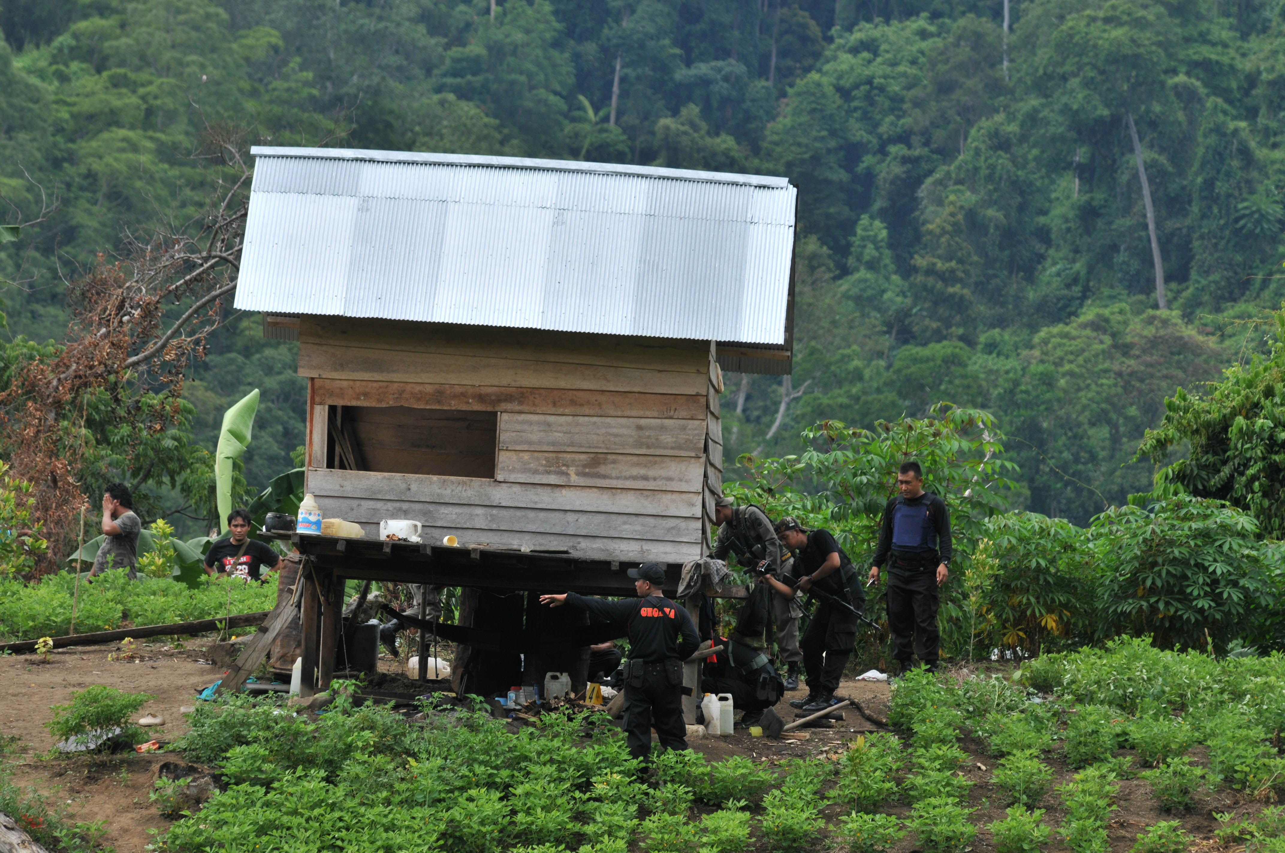 (Berita Daerah – Pairgi) Sejumlah anggota Gegana Brimob Polda Sulteng melakukan olah tempat kejadian perkara (TKP) kontak senjata antara kelompok teroris Santoso dan aparat kemanan di Pegunungan Salum Pangi, Pairgi, Sulawesi Tengah, Sabtu (4/4). Pada tempat tewasnya salah satu anggota kelompok teroris tersebut ditemukan dua buah bom lontong.
