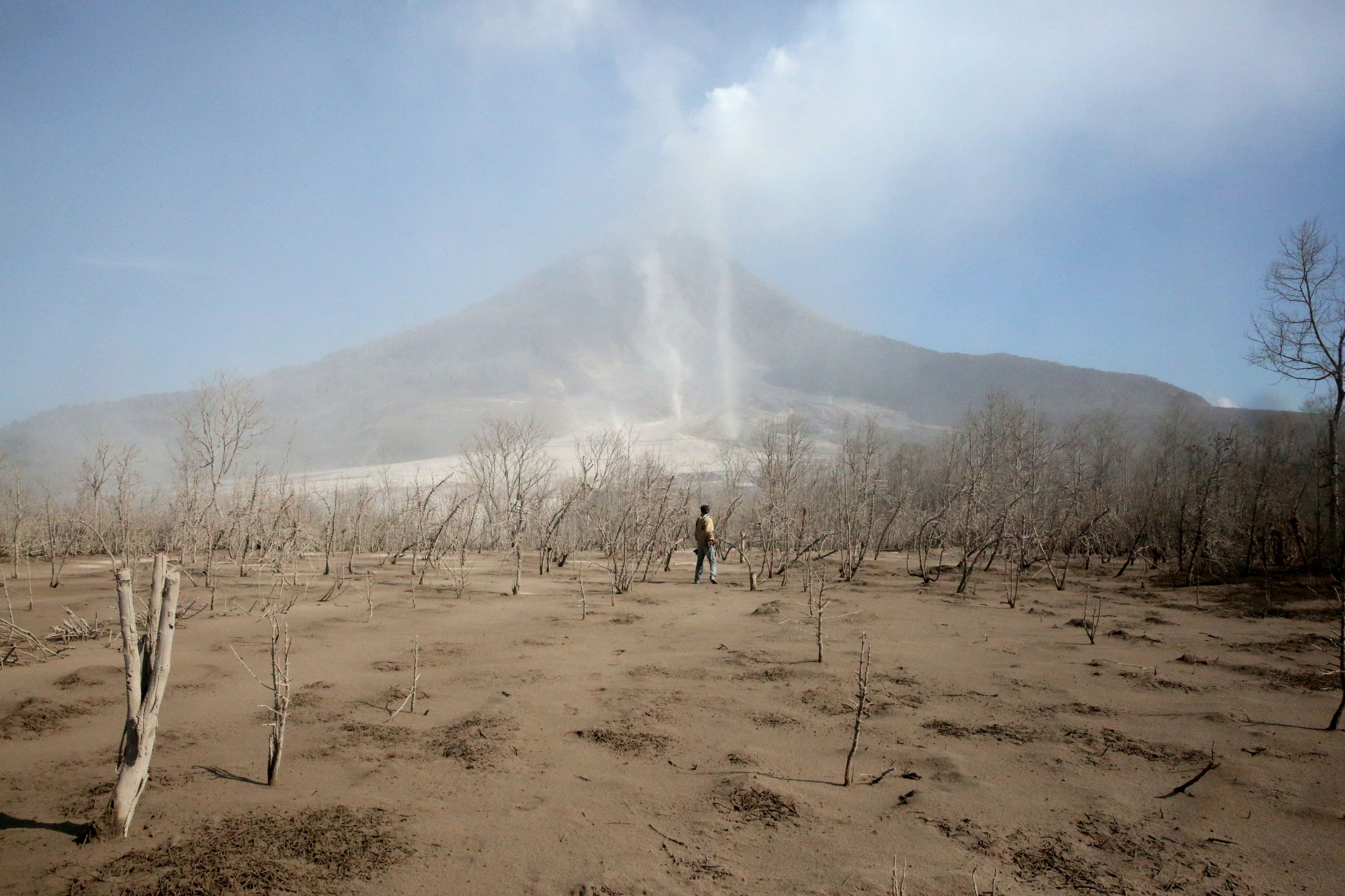 (Berita Daerah – Karo) Seorang warga di perkebunan kopi yang rusak akibat erupsi gunung sinabung di Desa Sibintun, Payung, Karo, Sumatera Utara, Jumat (3/4). Sejak Rabu (1/4) aktivitas gunung api sinabung yang masih berstatus siaga (level III) meningkat dan laporan Pos Pengamatan Gunung Sinabung PVMBG pada Kamis (2/4) terukur 118 kali gempa guguran dengan amplitudo maksimum 5-113 mm, tremor menerus, terjadi 22 kali awan panas guguran dengan puncak sejauh 4 km ke selatan dan 1 km ke tenggara, tinggi abu vulkanik 2 km .