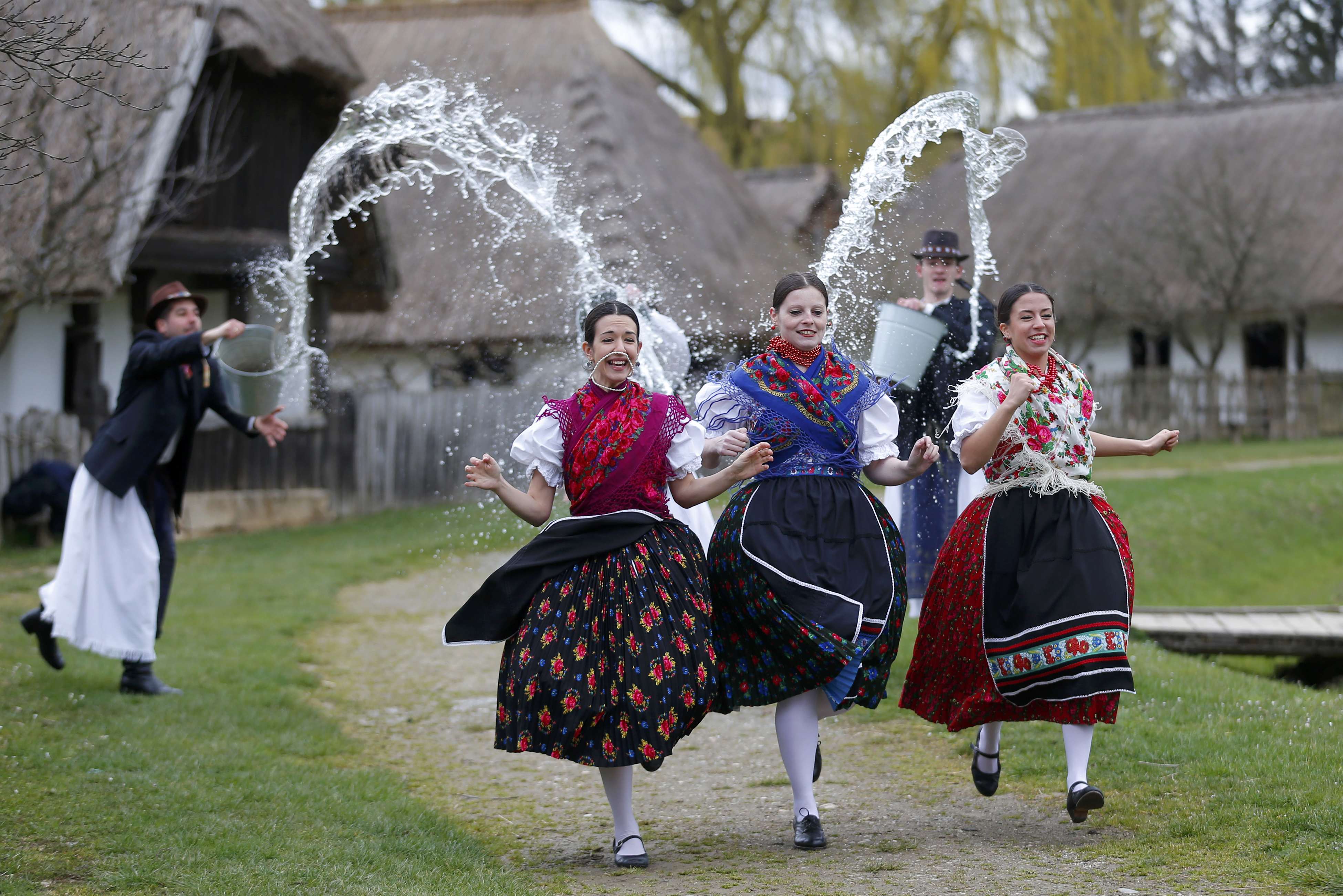 Women run as men throw water at them as part of traditional Easter celebrations, during a media presentation in Szenna April 3, 2015. Locals celebrate Easter with the traditional "watering of the girls", a fertility ritual rooted in Hungarian tribes' pre-Christian past, going as far back as the second century after Christ. REUTERS/Laszlo Balogh *** Local Caption *** Para pria menyiram air ke arah perempuan yang berlari yang menjadi bagian dari perayaan Paskah tradisional saat presentasi media di Szenna, Hongaria, Jumat (3/4). Warga setempat merayakan Paskah dengan "menyiram perempuan", sebuah ritual kesuburan yang berasal dari tradisi suku Hongaria sebelum masuknya Nasrani, dari sekitar abad kedua Masehi. ANTARA FOTO/REUTERS/Laszlo Balogh/ox/15.