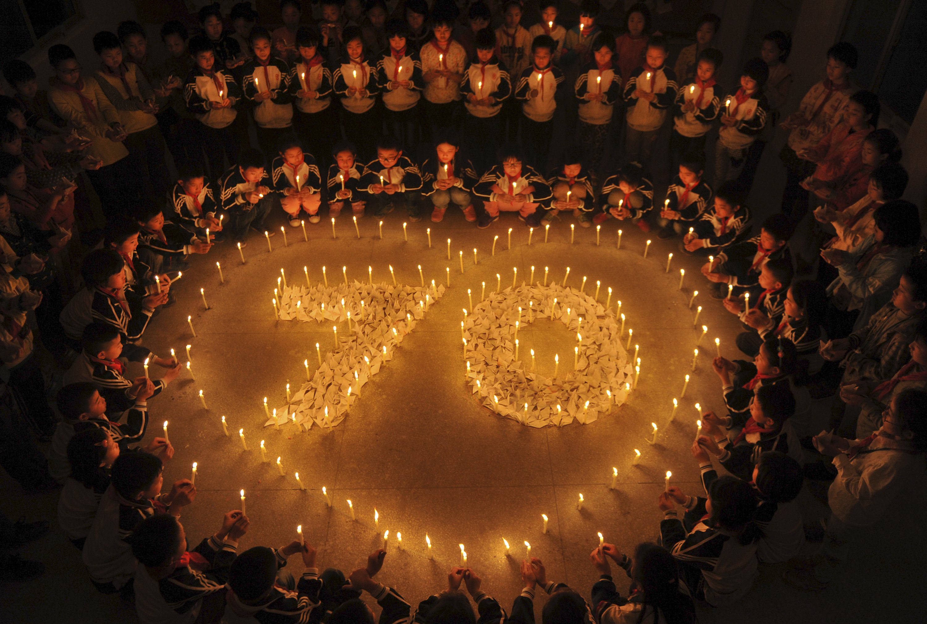 Primary school students surround the number "70" , which is formed by candles and paper cranes, during a memorial service to mourn the war martyrs of World War Two, ahead of the Qingming Festival, or Tomb Sweeping Festival, in Shangrao, Jiangxi province April 2, 2015. China will mark the 70th anniversary of the end of World War Two this year. The Qingming festival, which falls on April 5 this year, is a day for the Chinese to remember and honour their ancestors. Picture taken April 2, 2015. REUTERS/Stringer TPX IMAGES OF THE DAY