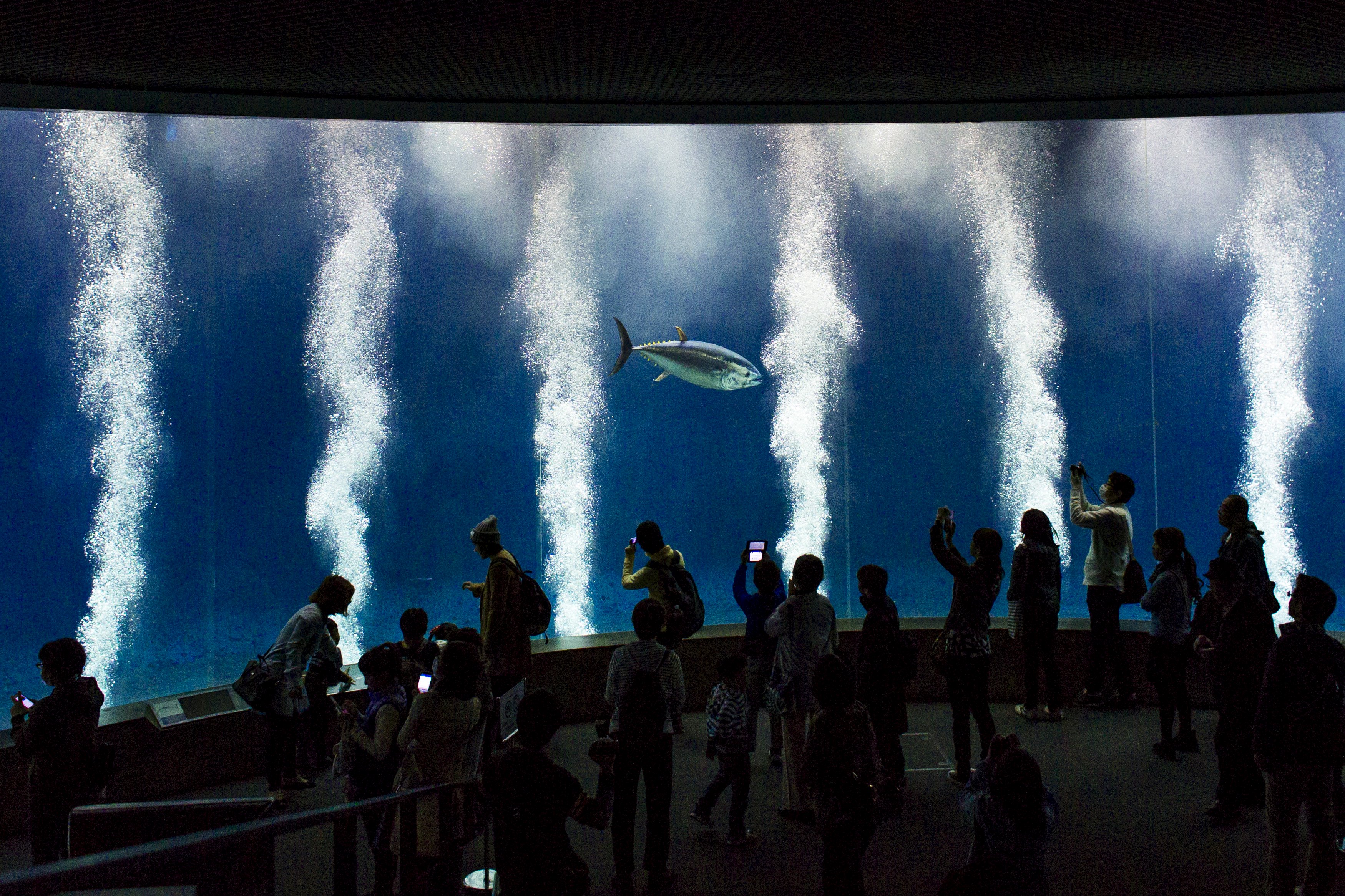 People look at a Pacific bluefin tuna as it swims in a tank in the Tokyo Sea Life Park in Tokyo, April 2, 2015. All but one of the nearly 160 tuna and bonito fish have died for unknown reasons over recent months, leaving this one tuna the last remaining fish of the vast tank's original population, local media reported. REUTERS/Thomas Peter TPX IMAGES OF THE DAY *** Local Caption *** Pengunjung memperhatikan tuna sirip biru Pasifik yang berenang di dalam sebuah kolam di Tokyo Sea Life Park, Tokyo, Jepang, Kamis (2/4). Dari semua 160 ikan tuna dan bonito, hanya satu yang dapat hidup, sementara 159 lainnya mati tanpa diketahui sebabnya dalam beberapa bulan terakhir, menjadikan ikan tuna itu satu-satunya ikan yang bertahan dalam populasi asli akuarium tersebut. ANTARA FOTO/REUTERS/Thomas Peter/ox/15.