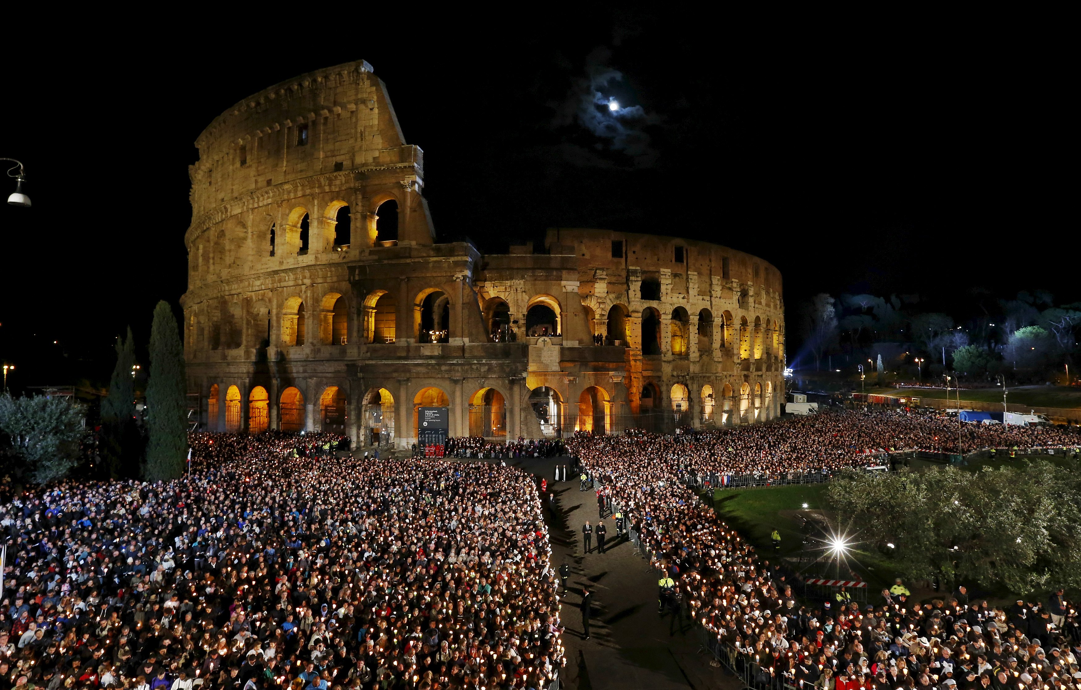 Faithful attend the "Via Crucis" (Way of the Cross) procession, which commemorates the crucifixion of Jesus Christ, led by Pope Francis at the Colosseum in Rome April 3, 2015. REUTERS/Alessandro Bianchi TPX IMAGES OF THE DAY *** Local Caption *** Umat Katolik mengikuti prosesi "Via Crucis" (Jalan Salib), memperingati penyaliban Yesus Kristus, dipimpin Paus Fransiskus di Koloseum, Roma, Jumat (3/4). ANTARA FOTO/REUTERS/Alessandro Bianchi/djo/15