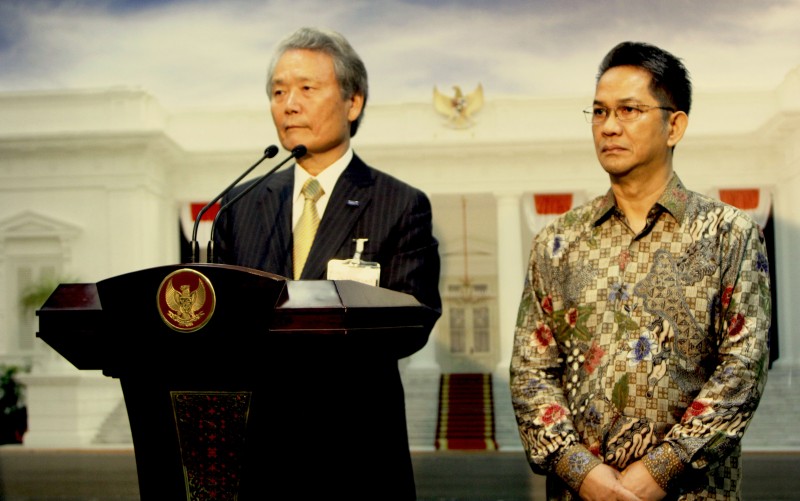 Ketua Keidanren Sadayuki Sakakibara usai diterima Presiden Jokowi di Istana Negara Rabu (8/4)