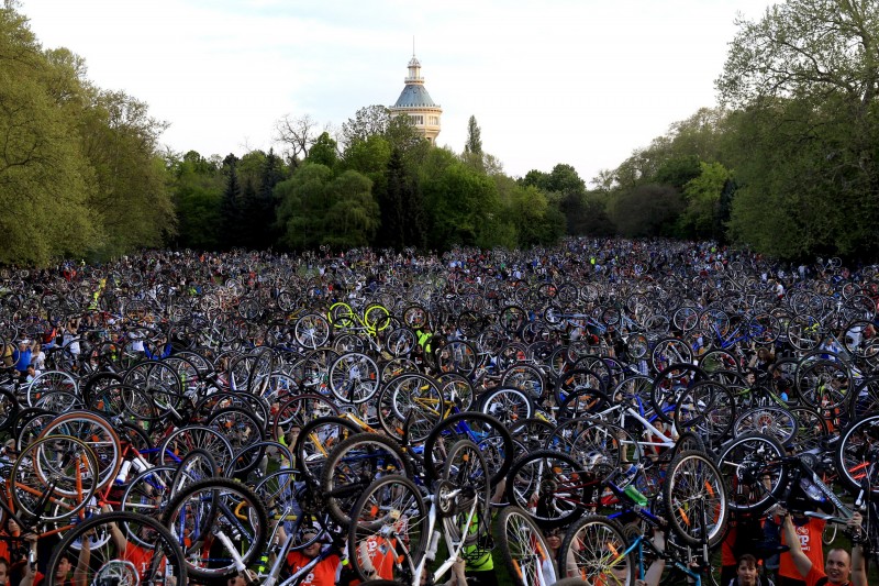 Ribuan pesepeda mengangkat sepeda mereka setelah berkeliling Budapest, Hongaria, Sabtu (25/4). Mereka menggelar aksi tersebut untuk menuntut dibangunnya infrastruktur yang lebih besar untuk mengakomodir para pesepeda di kota Budapest, dimana ratusan ribu orang menggunakan sepeda.