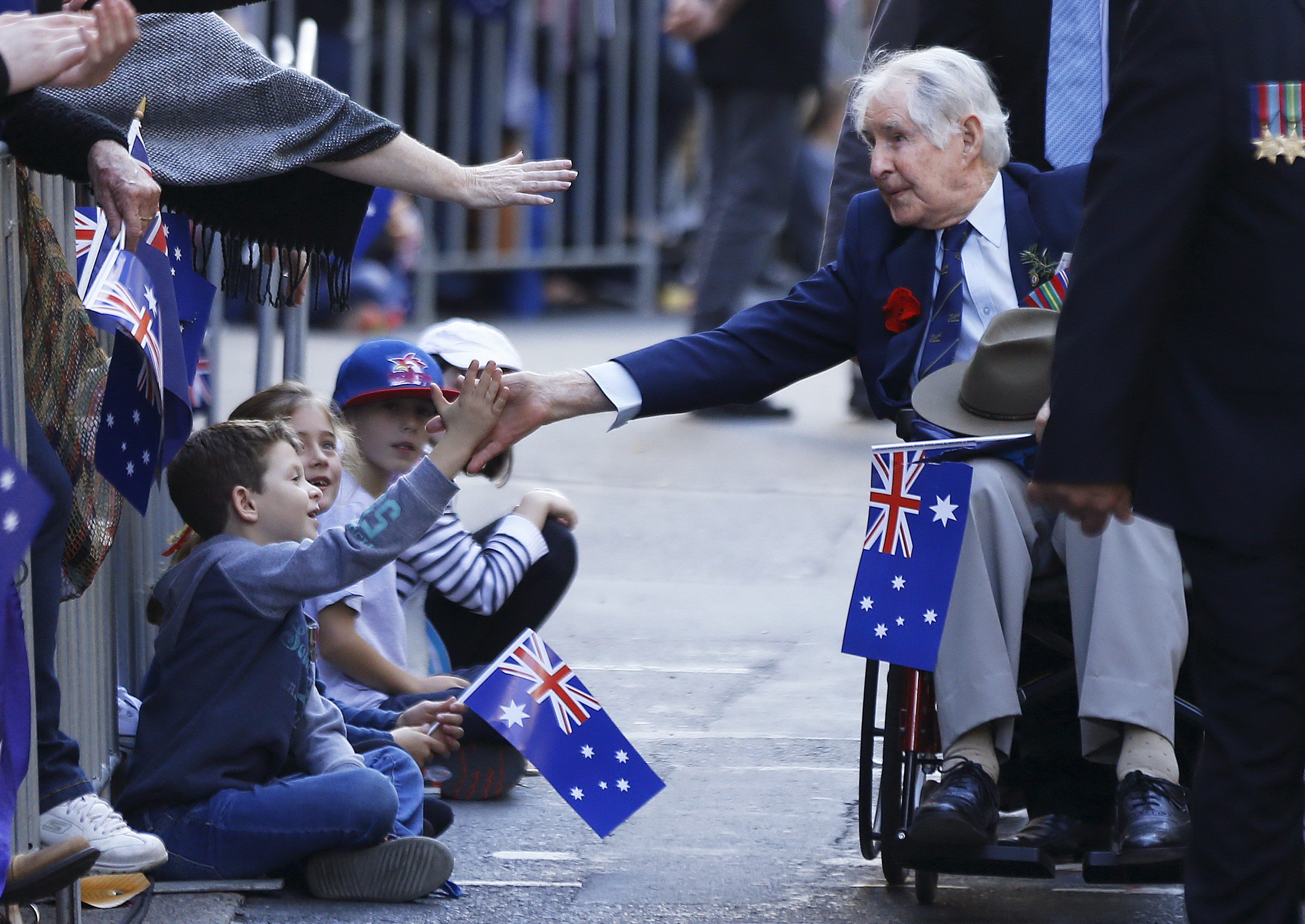 An Australian war veteran high-fives with children during an ANZAC Day parade marking the 100th anniversary of the formation of the ANZAC alliance in Sydney, Australia, April 25, 2015. ANZAC, which stands for Australian and New Zealand Army Corps, formed on April 25, 1915 as Australian and New Zealand soldiers formed part of the allied expedition that set out to capture the Gallipoli peninsula in Turkey. REUTERS/Jason Reed TPX IMAGES OF THE DAY